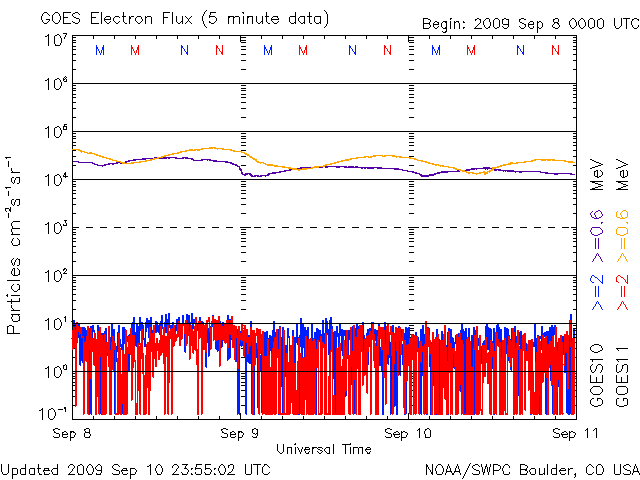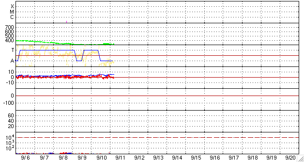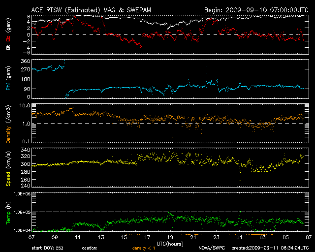 - 2009/ 9/10 11:30 速度300km/sと遅い太陽風が続いています。