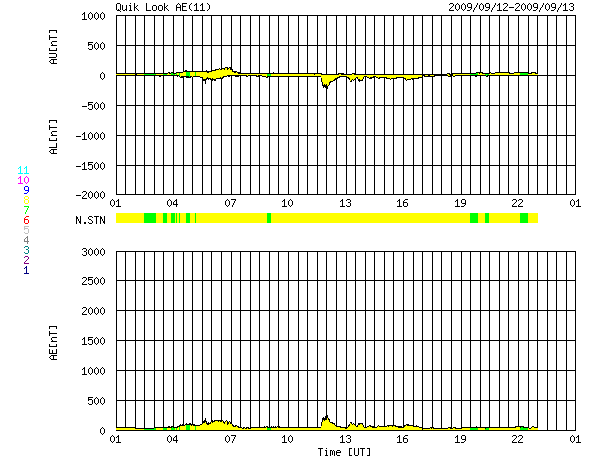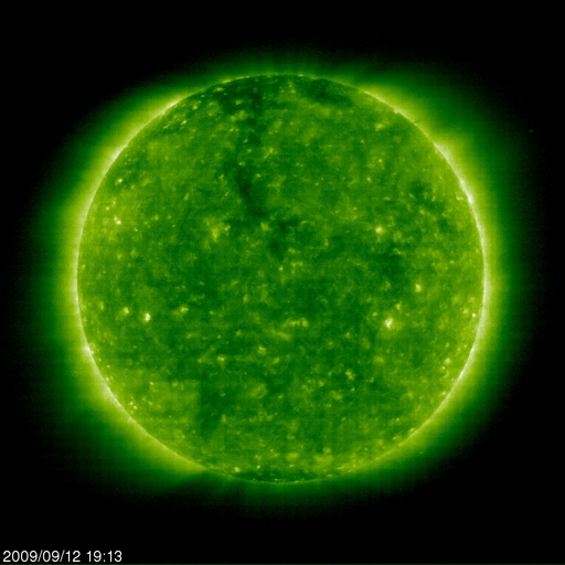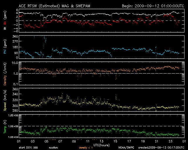 2009/ 9/13 09:17 更新 太陽風は300km/秒とかなり低速のままです。太陽も無黒点が続いています。 担当 篠原 太陽風は、速度300km/秒、磁場強度4nTと、 かなり低速で穏やかな状態が続いています。 地球の磁気圏も静穏で、 AE指数は、小さな変化が見られる程度です。 27日周期の図を参考にすると、もう3日ほど穏やかな太陽風が続きそうです。 SOHO EIT195の太陽コロナを見ると、 太陽の北極から低緯度側へ伸びている細いコロナホールが、 太陽の中心線に達しつつあります。 3日後に太陽風の変化がやってくるとすると、 このコロナホールからの影響と考えられます。 一方、昨日や一昨日の太陽コロナ写真では、 太陽の北半球低緯度付近に、かなり淡いコロナホールが見えていました。 ここからの影響はないまま、3日後を迎えるのか、 その前に、この淡い領域からの影響がやってくるのか、 やって来ても小さな変化だと思いますが、太陽風の推移に注目したいところです。 太陽は、今日も無黒点です。 9月になっても、非常に静かな状態が続いています。 SOHO EIT195による、太陽コロナの様子。13日4時(世界時12日19時)。 (c) SOHO (ESA & NASA) ![]() ACEが観測した太陽風の磁場(1番上の枠、白線は全体の強度、赤線は南北成分) および、太陽風の密度(3番目の橙線)、速度(4番目の黄線) (c) NOAA/SWPC ![]() リアルタイムAE指数 下段のAEグラフの値が高くなると、オーロラ活動が活発化しています。 (c) 京都大学, NICT ![]() シベリアで観測された3日間の磁場データ 右側の3分の1が、昨日のデータになります。グラフが上がったり下がったりすると、オーロラ活動が活発化しています。 (c) NICT ![]() 27日の太陽周期に合わせたデータプロット 太陽が同じ面を地球に向けていた27日前の変化から、今後を予想することができます。 (c) NICT