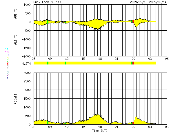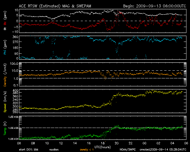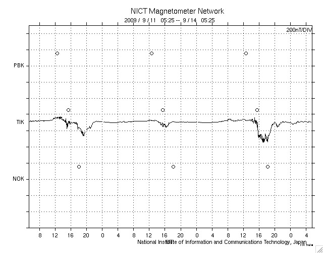 2009/ 9/14 14:28 更新 太陽風の速度が380km/秒に上がっています。平均的な速度レベルに戻ったくらいです。 担当 篠原 太陽風に変化が起こり、磁気圏もやや活動的になっています。 昨日の午後より、太陽風の磁場が、-3〜-5nTほどで連続的に南寄りになりました。 そのため、磁気圏活動が小規模ですが強まっています。 AE指数では、300〜500nTの変化が比較的長い時間続いています。 更に、今日未明の14日4時(世界時13日19時)より、太陽風の速度が上昇を始め、 300km/秒から380km/秒に高まっています。 今のところ、変化としてはたいした規模ではなく、 上昇して平均的な速度に戻ったという程度です。 速度が高まると、南向き磁場の影響はより大きくなります。 磁場の南向き傾向が今後も続くと、 磁気圏の変化はより大きくなる可能性がありますので、注意して下さい。 今後の変化ですが、磁場強度は5nTにとどまっているので、 太陽風速度が大きく上昇することはないように思います。 前周期に速度が高まったのは、もう2日ほど後のことでした。 SOHO EIT195では、縦に伸びるコロナホールは、 太陽の中央線を超えて、西側へ移動しています。 今周期も、太陽風の速度が500km/秒を超えるほどに高まるのは、 16日頃からとなるのではないでしょうか。 太陽は、今日も無黒点です。 SOHO EIT195による、太陽コロナの様子。14日10時(世界時14日1時)。 (c) SOHO (ESA & NASA) ![]() ACEが観測した太陽風の磁場(1番上の枠、白線は全体の強度、赤線は南北成分) および、太陽風の密度(3番目の橙線)、速度(4番目の黄線) (c) NOAA/SWPC ![]() リアルタイムAE指数 下段のAEグラフの値が高くなると、オーロラ活動が活発化しています。 (c) 京都大学, NICT ![]() シベリアで観測された3日間の磁場データ 右側の3分の1が、昨日のデータになります。グラフが上がったり下がったりすると、オーロラ活動が活発化しています。 (c) NICT ![]() 27日の太陽周期に合わせたデータプロット 太陽が同じ面を地球に向けていた27日前の変化から、今後を予想することができます。 (c) NICT