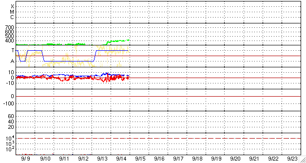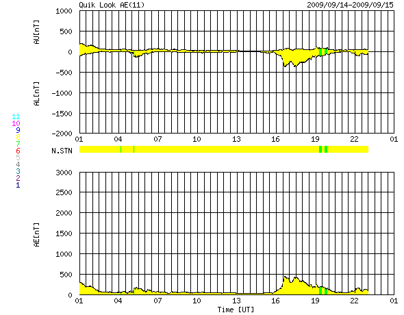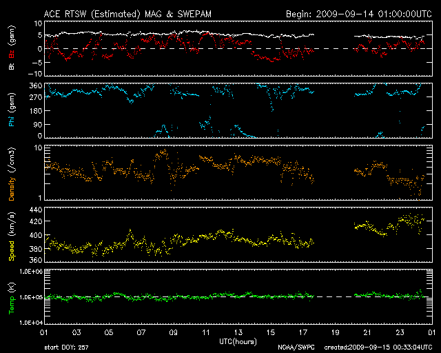 2009/ 9/15 09:33 更新 400km/秒と太陽風は比較的穏やかです。明日以降、太陽風は高速風に変わりそうです。 担当 篠原 太陽風は、速度400km/秒、磁場強度5nTと、どちらも平均的な値で推移しています。 磁場の南北成分は、南を向いたり、北を向いたり、 時間帯によってゆったりと変化しています。 そこそこに速度、磁場強度ともにあるため、磁場が南を向いた時間帯では、 小規模ですが、オーロラ活動が発生しています。 AE指数では、500nTの変動がひとつと、その他にも小さな変化が発生しています。 今日も、現在の様な比較的穏やかな状態が続くと思われます。 そして、明日くらいから高速の太陽風が始まる可能性があります。 27日周期の図や、SOHO EIT195のコロナホールの様子などから考えると、 高速風の始まりは、明日遅くか、明後日になるかもしれません。 前周期では、500km/秒台の太陽風は4日ほど続きました。 最高速度は550km/秒で、それほど高くはありません。 今周期も、コロナホールの様子から、 同じ程度の高速風となるのではないでしょうか。 高速風の前半では、オーロラ活動が活発になりやすいので、 注目して下さい。 太陽は無黒点で、静かな状態が続いています。 9月も半分過ぎましたが、今月も無黒点の日数が多くなりそうです。 SOHO EIT195による、太陽コロナの様子。14日22時(世界時14日13時)。 (c) SOHO (ESA & NASA) ![]() ACEが観測した太陽風の磁場(1番上の枠、白線は全体の強度、赤線は南北成分) および、太陽風の密度(3番目の橙線)、速度(4番目の黄線) (c) NOAA/SWPC ![]() リアルタイムAE指数 下段のAEグラフの値が高くなると、オーロラ活動が活発化しています。 (c) 京都大学, NICT ![]() シベリアで観測された3日間の磁場データ 右側の3分の1が、昨日のデータになります。グラフが上がったり下がったりすると、オーロラ活動が活発化しています。 (c) NICT ![]() 27日の太陽周期に合わせたデータプロット 太陽が同じ面を地球に向けていた27日前の変化から、今後を予想することができます。 (c) NICT