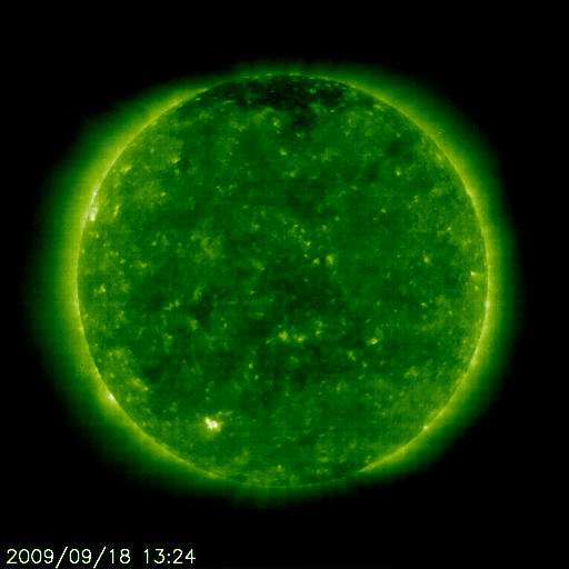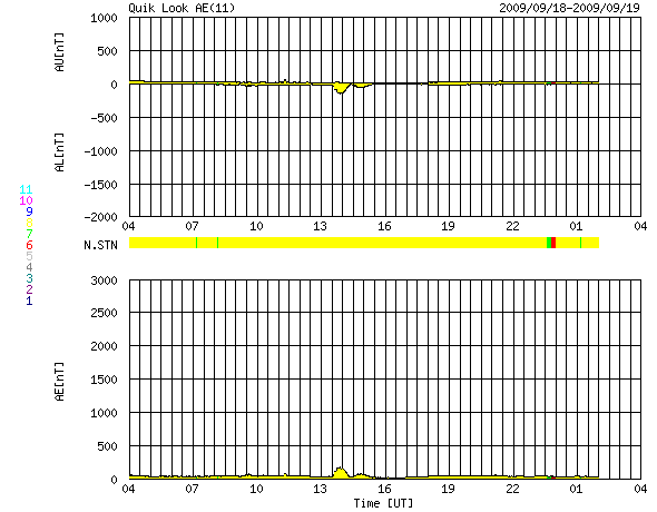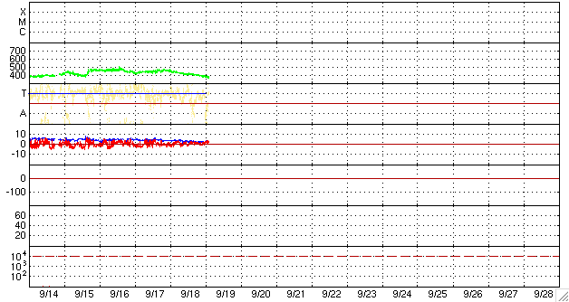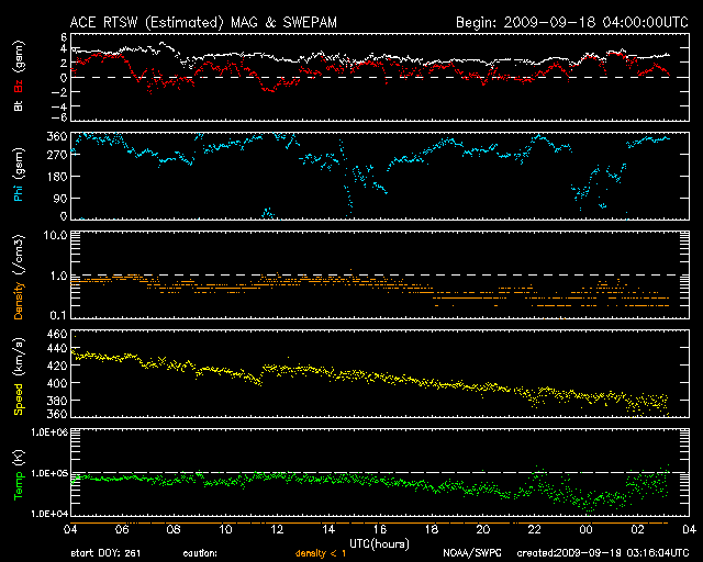 2009/ 9/19 12:16 更新 太陽風の速度は下がり始めました。1週間ほど穏やかな状態が続くでしょう。 担当 篠原 太陽風の速度は早々と低下を始め、昨夜のうちに400km/秒台を割り、 現在は380km/秒となっています。 磁場強度も、3nT前後と弱まっています。 磁気圏も静かです。 AE指数は、ほとんど変化していません。 ほとんど盛り上がらないまま、高速風帯の名残りが通り過ぎてしまいました。 この後はしばらく、穏やかな宇宙天気が続きます。 次の変化としては、27日周期の図で8月30-31日に見られる、 小さな速度の高まりでしょうか。 回帰は、9月26日頃と考えられますので、 これから1週間は静かな状態が続きそうです。 SOHOのウェブサイトは、今週末と来週末はメンテナンスのため停電だそうで、 週が明けるまで最新データは見られません(時差の関係で、火曜日まで待たされそうです)。 サイトそのものも停止しているので、今日はヨーロッパのESAのSOHOサイトを紹介します。 見られるデータは昨夜までですが、今日はこちらのページをどうぞ。 従って、今日のEIT195は昨夜の太陽です。 太陽コロナは全体的にのっぺりとしていて、コロナホールは見られません。 この左端のもう少し向こう側に、 9月26日の変化をもたらすと予想しているコロナホールがあります。 太陽は、今日も黒点はありません。 こちらも同様に、昨夜の写真です。 SOHO EIT195による、太陽コロナの様子。18日22時半(世界時18日13時半)。 (c) SOHO (ESA & NASA) ![]() SOHOによる太陽の可視光写真。黒点はありません。18日22時半(世界時18日13時半)。 (c) SOHO (ESA & NASA) ![]() ACEが観測した太陽風の磁場(1番上の枠、白線は全体の強度、赤線は南北成分) および、太陽風の密度(3番目の橙線)、速度(4番目の黄線) (c) NOAA/SWPC ![]() リアルタイムAE指数 下段のAEグラフの値が高くなると、オーロラ活動が活発化しています。 (c) 京都大学, NICT ![]() シベリアで観測された3日間の磁場データ 右側の3分の1が、昨日のデータになります。グラフが上がったり下がったりすると、オーロラ活動が活発化しています。 (c) NICT ![]() 27日の太陽周期に合わせたデータプロット 太陽が同じ面を地球に向けていた27日前の変化から、今後を予想することができます。 (c) NICT