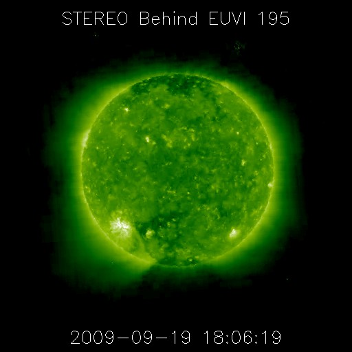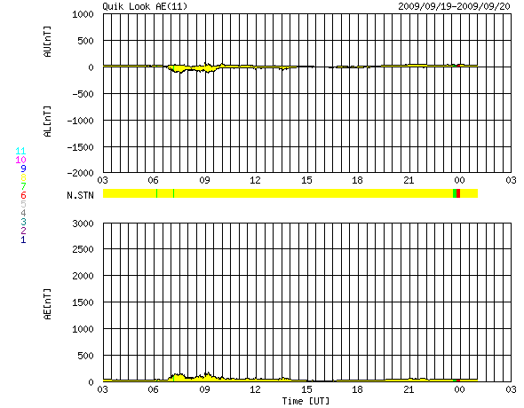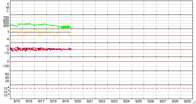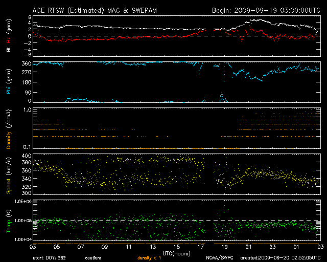 2009/ 9/20 11:53 更新 太陽風の密度が大きく下がりました。現在の速度は350km/秒と低速で、磁気圏も静かです。 担当 篠原 太陽風のプラズマ粒子の密度が少なくなっています。 昨日のニュースの頃から既に0.3個/cm^3くらいに下がっていたのですが、 その後、更に減少し、ACEの図では0.1個/cm^3にくっつくようなグラフになりました。 このあたりまで下がると、ACEの観測装置の限界になるのでしょう。 グラフでは、0.1以下のプロットはされていません。 この影響で、太陽風速度の観測も誤差が大きくなり、グラフは拡散しています。 それでも、350km/秒前後の低速風が続いていたことは分かります。 現在の密度は、0.5個/cm^3くらいに上がっています。 また、磁場強度は3nT付近と弱く、穏やかな太陽風です。 磁気圏も静かです。 AE指数はほとんど変化していません。 今週いっぱいは、このまま穏やかに過ぎて行きそうです。 SOHOのWebページが停止しているので、今日はSTEREO Behindの太陽コロナ写真を掲載します。 STEREO Behindは、今や地球から60度ほど離れた地点に達していて、 見えている太陽面の時差は、4日を越えるほどになりました。 掲載の写真は、24日頃に地球から見える太陽だと考えて下さい。 すると、南半球の中緯度付近のコロナホールは、太陽の中心線を越えるくらいにいます。 地球への影響を3日後と考えると、太陽風の変化は27日くらいにやってくることになりそうです。 コロナホールの左には、明るい活動領域が見えています。 現在の活動度はやや落ち着いているように見えますが、 ここに黒点があるかどうか、地球から見える様になるのももうすぐでしょう。 GOESのX線グラフは、上昇を始めています。 上空の明るい部分が見え始めている様です。 STEREO Behindによる太陽コロナ。地球よりも4日ほど先の太陽を見ています。20日3時(世界時19日18時) (c) NASA ![]() ACEが観測した太陽風の磁場(1番上の枠、白線は全体の強度、赤線は南北成分) および、太陽風の密度(3番目の橙線)、速度(4番目の黄線) (c) NOAA/SWPC ![]() リアルタイムAE指数 下段のAEグラフの値が高くなると、オーロラ活動が活発化しています。 (c) 京都大学, NICT ![]() シベリアで観測された3日間の磁場データ 右側の3分の1が、昨日のデータになります。グラフが上がったり下がったりすると、オーロラ活動が活発化しています。 (c) NICT ![]() 27日の太陽周期に合わせたデータプロット 太陽が同じ面を地球に向けていた27日前の変化から、今後を予想することができます。 (c) NICT