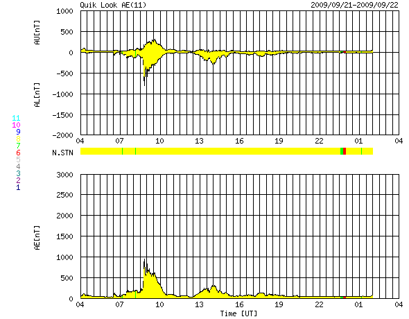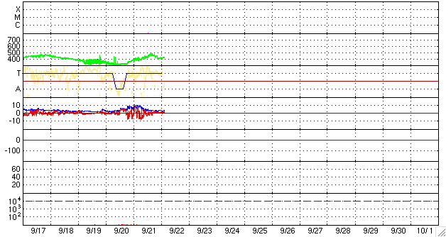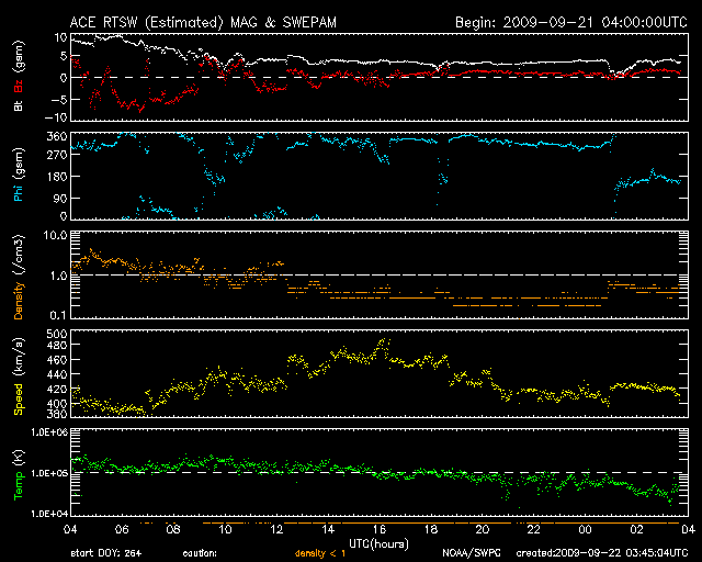 2009/ 9/22 12:46 更新 太陽風は460km/秒まで速度が上がり、現在は420km/秒に下がっています。1026黒点群が上がって来ました。 担当 篠原 昨日のニュースの後から、太陽風の磁場が南を向き、 -5〜-8nTの状態が4時間ほど続きました。 その影響で、AE指数800nTほどの中規模のオーロラ活動が発生しています。 その後、速度は460km/秒くらいまで上がったのですが、 逆に磁場強度は下がり(4nT付近)、南北成分もほとんど0nT付近に弱まってしまったため、 目立った磁気圏活動は続きませんでした。 現在の太陽風は、速度420km/秒、磁場強度4nTと、 どちらも平均的なレベルになっています。 この後も、基本的には穏やかな状態が続きそうです。 SOHO EIT195の写真が帰って来ました。 STEREO Behindeで見えていた南半球中緯度のコロナホールが、こちら側に回って来ています。 もう2日ほどで中心線に達し、 その3日後くらいから太陽風に変化が見られるという予想ができます。 また、コロナホールの向こう側には、明るい活動領域が光っています。 可視光写真では、黒点と白斑が並んで見えています。 1026黒点群です。 X線のグラフでは、B1の小さな変動がひとつありますが、特に活発な様子は見られません。 SOHO EIT195による、太陽コロナの様子。22日12時半(世界時22日3時半)。 (c) ESA & NASA ![]() SOHOによる太陽の可視光写真。1026黒点群が上がって来ました。 (c) ESA & NASA ![]() ACEが観測した太陽風の磁場(1番上の枠、白線は全体の強度、赤線は南北成分) および、太陽風の密度(3番目の橙線)、速度(4番目の黄線) (c) NOAA/SWPC ![]() リアルタイムAE指数 下段のAEグラフの値が高くなると、オーロラ活動が活発化しています。 (c) 京都大学, NICT ![]() シベリアで観測された3日間の磁場データ 右側の3分の1が、昨日のデータになります。グラフが上がったり下がったりすると、オーロラ活動が活発化しています。 (c) NICT ![]() 27日の太陽周期に合わせたデータプロット 太陽が同じ面を地球に向けていた27日前の変化から、今後を予想することができます。 (c) NICT