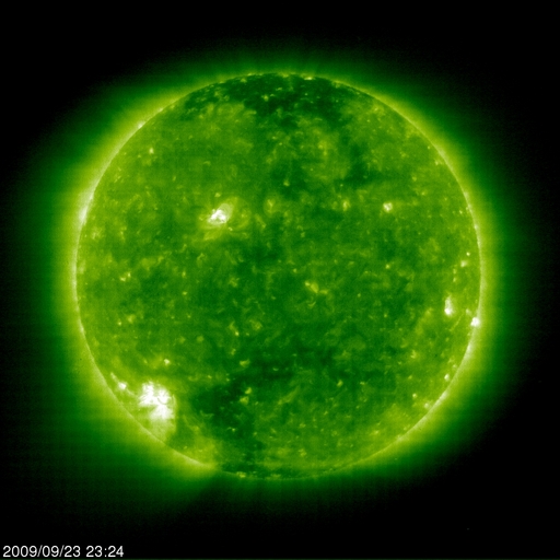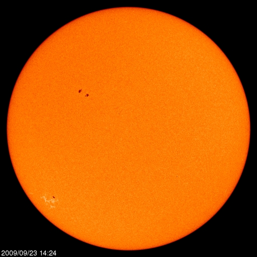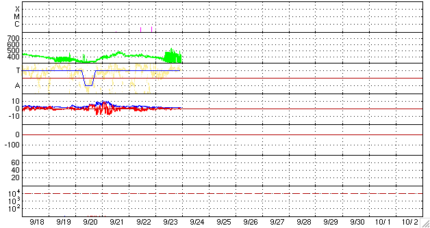 2009/ 9/24 09:28 更新 2つの黒点群は残っていますが、目立った活動はありません。太陽風の密度が少なくなっています。 担当 篠原 太陽面には、1026、1027とふたつの黒点群が見えています。 昨日以降、目立った変化は無く、1027黒点群の発達もこのあたりまでの様です。 GOESのX線グラフも、強度は下がり気味で、フレアなども観測されていません。 (と書いていたら、ぎりぎりB1クラスのフレアが発生した様です) 黒点群がふたつと、久しぶりににぎやかな太陽面になっていますが、 活動としては穏やかです。 太陽風は、プラズマの密度が大きく減少しています。 ACEの密度グラフ(橙色)は、0.1の線にも点が打たれておらず、 かなり低い状態になっているようです。 この影響で、速度の値が大きくばらついています。 全体的な雰囲気から、速度は300km/秒程度に下がっている様です。 磁場強度は、2nTと弱まったままです。 磁気圏は非常に静穏です。 太陽風が低速であることや、 磁場強度が弱く、南北成分も0nT付近か北寄りになっているためです。 明日くらいまでは、穏やかな状態が続くでしょう。 26日か27日あたりから、コロナホールの影響で太陽風の速度が上昇すると思われます。 ただし、前周期は、500km/秒にやっと届いた程度の高まりで、 今回も大きくは上昇しないでしょう。 SOHO EIT195による、太陽コロナの様子。24日8時半(世界時23日23時半)。 (c) SOHO (ESA & NASA) ![]() SOHOによる太陽の可視光写真。南半球に1026黒点群、北半球に1027黒点群が見えています。 (c) SOHO (ESA & NASA) ![]() GOES衛星の太陽X線データ (c) NOAA/SWPC ![]() ACEが観測した太陽風の磁場(1番上の枠、白線は全体の強度、赤線は南北成分) および、太陽風の密度(3番目の橙線)、速度(4番目の黄線) (c) NOAA/SWPC ![]() リアルタイムAE指数 下段のAEグラフの値が高くなると、オーロラ活動が活発化しています。 (c) 京都大学, NICT ![]() シベリアで観測された3日間の磁場データ 右側の3分の1が、昨日のデータになります。グラフが上がったり下がったりすると、オーロラ活動が活発化しています。 (c) NICT ![]() 27日の太陽周期に合わせたデータプロット 太陽が同じ面を地球に向けていた27日前の変化から、今後を予想することができます。 (c) NICT