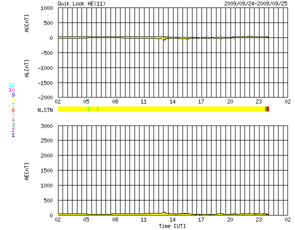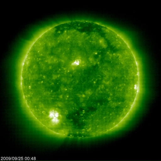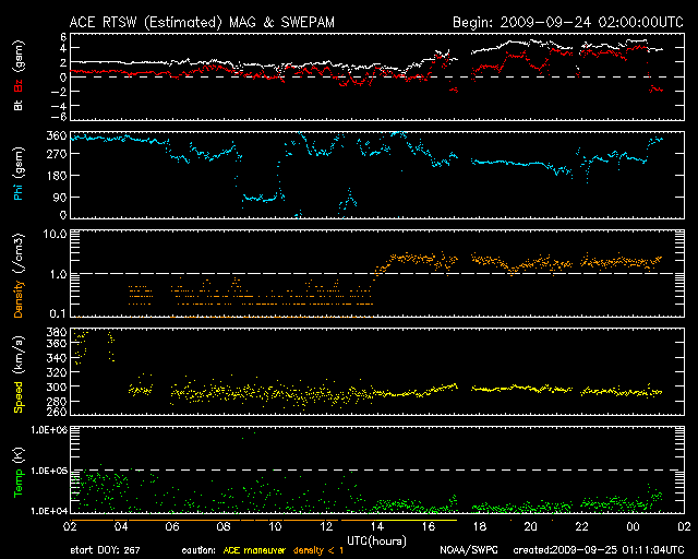 2009/ 9/25 10:11 更新 C2のフレアが発生しました。太陽風はかなり低速で、磁気圏も静かです。 担当 篠原 希薄になっていた太陽風のプラズマ密度は、昨夜で回復し、 現在は1個/cm^3と普通の状態に戻っています。 それにともなって、速度の観測データも安定しました。 現在の太陽風の速度は、290km/秒と300km/秒台を割っています。 かなり遅い状態です。 磁場強度は、プラズマ密度の増加とともに、2nTから5nTへ増加し、 平均的な値を回復しています。 全体として見れば、穏やかな太陽風が依然続いています。 磁気圏も非常に静かです。 AE指数は全く変化がありません。 太陽風の速度が低いことと、磁場が北向きで推移しているためでしょう。 今後の太陽風ですが、コロナホールの影響はもう少し先、明日以降ではないかと思います。 ただ、磁場強度、密度が平均的なレベルに上がったという変化に対応して、 速度もいくらか上がるかもしれません。 SOHO EIT195では、南半球側のコロナホールがちょうど太陽の中心線上に来ています。 次にやって来る高速風の中心は、28日頃になりそうです。 この状態で見るコロナホールの大きさは、前周期よりもだいぶ広がっています。 緯度が高めなので、影響が及びにくくなるという点がありますが、 今度の高速風は、3〜4日程度続くものになるかもしれません。 太陽には、南半球中緯度に1026黒点群、北半球低緯度に1027黒点群が見えています。 南半球の1026黒点群の横には、白斑が広がっています。 そのためでしょうか、EIT195の太陽コロナでは、 黒点としては小さな1026黒点群のほうが、大きく光り輝いています。 ちょうど最新のX線データで、C2のフレアが発生しました。 Cクラスのフレアは、7月6日以来です。 SOHO EIT195による、太陽コロナの様子。25日10時(世界時25日1時)。 (c) SOHO (ESA & NASA) ![]() SOHOによる太陽の可視光写真。南半球に1026黒点群、北半球に1027黒点群が見えています。 (c) SOHO (ESA & NASA) ![]() ACEが観測した太陽風の磁場(1番上の枠、白線は全体の強度、赤線は南北成分) および、太陽風の密度(3番目の橙線)、速度(4番目の黄線) (c) NOAA/SWPC ![]() リアルタイムAE指数 下段のAEグラフの値が高くなると、オーロラ活動が活発化しています。 (c) 京都大学, NICT ![]() シベリアで観測された3日間の磁場データ 右側の3分の1が、昨日のデータになります。グラフが上がったり下がったりすると、オーロラ活動が活発化しています。 (c) NICT ![]() 27日の太陽周期に合わせたデータプロット 太陽が同じ面を地球に向けていた27日前の変化から、今後を予想することができます。 (c) NICT