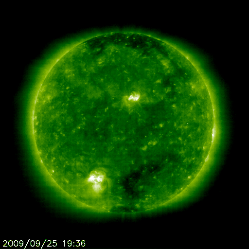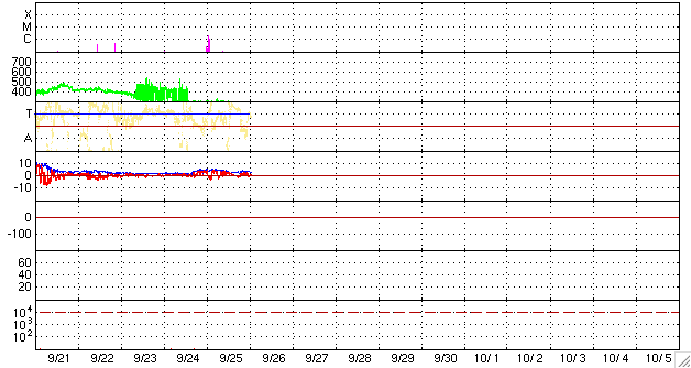 2009/ 9/26 12:27 更新 C2フレア以降、太陽は静穏です。太陽風もかなり低速で、穏やかです。 担当 篠原 ちょうど昨日のニュース更新時、25日10時(世界時25日1時)に、 1026黒点群(可視光写真の左下の黒点)でC2の小規模フレアが発生しました。 今日掲載のX線グラフでは、フレアの全体が見えています。 その後は、Aクラスの極小さな変動が数回起きただけで、太陽活動は穏やかです。 1026黒点群は、衰退傾向にあり、今日の写真ではとても小さくなっています。 1027黒点群も特に変化はなく、太陽の活動は穏やかに推移しそうです。 太陽風は、290km/秒前後とかなり遅い状態を保っています。 磁場強度が5nT近くに強まる変化も見られていましたが、特に何も起こりませんでした。 磁場の南北成分が北寄りになっていることもあり、磁気圏はとても穏やかです。 AE指数は全く変化していません。 この後、コロナホールの影響がやって来ると予想しています。 SOHO EIT195では、南半球側のコロナホールは、太陽の西側(右側)に進行していて、 太陽風の変化が近いことを示しています。 (SOHOのNASAのページは、今週末も停電です。ESAのサイトをどうぞ。 ただし、更新はここに掲載している写真までで停止しています。) 現在の太陽風には、変化の気配はまだ見えていません。 この後、磁場強度の上昇が始まり、やがて速度が高まって行くと予想されます。 前周期はやっと500km/秒に達する程度の変化でしたが、今回はどうなるでしょうか。 コロナホールが広がっているので、もう少し強い風になりそうに思います。 高速風の立ち上がりは、磁場強度が強まることもあり、 オーロラ観望はチャンスです。 SOHO EIT195による、太陽コロナの様子。26日4時半(世界時25日19時半)。 (c) SOHO (ESA & NASA) ![]() SOHOによる太陽の可視光写真。南半球に1026黒点群、北半球に1027黒点群が見えています。 (c) SOHO (ESA & NASA) ![]() GOES衛星の太陽X線データ (c) NOAA/SWPC ![]() ACEが観測した太陽風の磁場(1番上の枠、白線は全体の強度、赤線は南北成分) および、太陽風の密度(3番目の橙線)、速度(4番目の黄線) (c) NOAA/SWPC ![]() リアルタイムAE指数 下段のAEグラフの値が高くなると、オーロラ活動が活発化しています。 (c) 京都大学, NICT ![]() シベリアで観測された3日間の磁場データ 右側の3分の1が、昨日のデータになります。グラフが上がったり下がったりすると、オーロラ活動が活発化しています。 (c) NICT ![]() 27日の太陽周期に合わせたデータプロット 太陽が同じ面を地球に向けていた27日前の変化から、今後を予想することができます。 (c) NICT