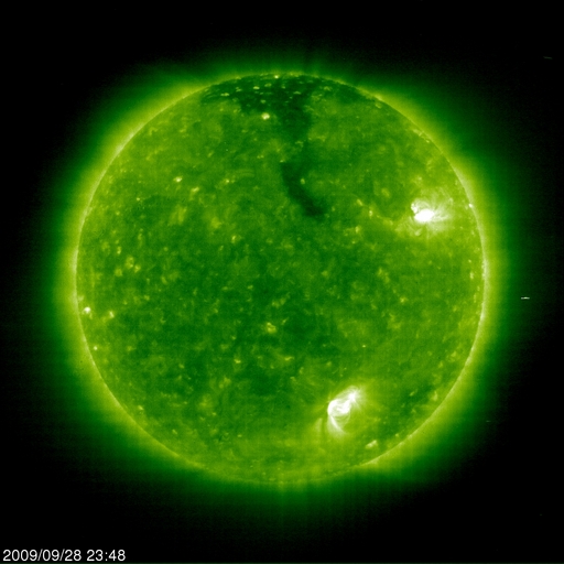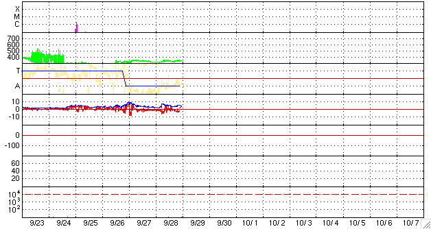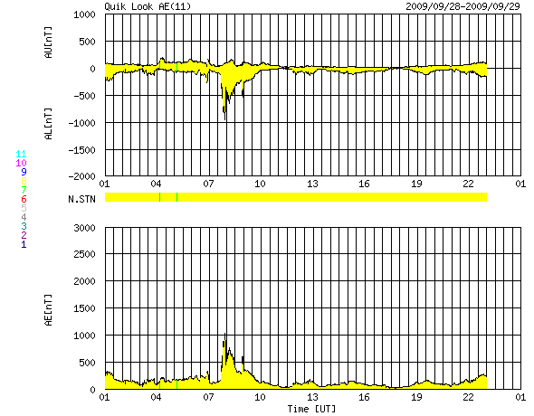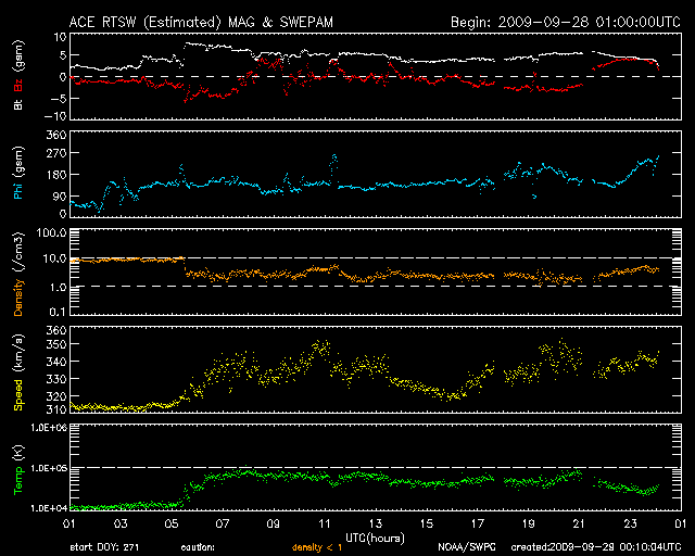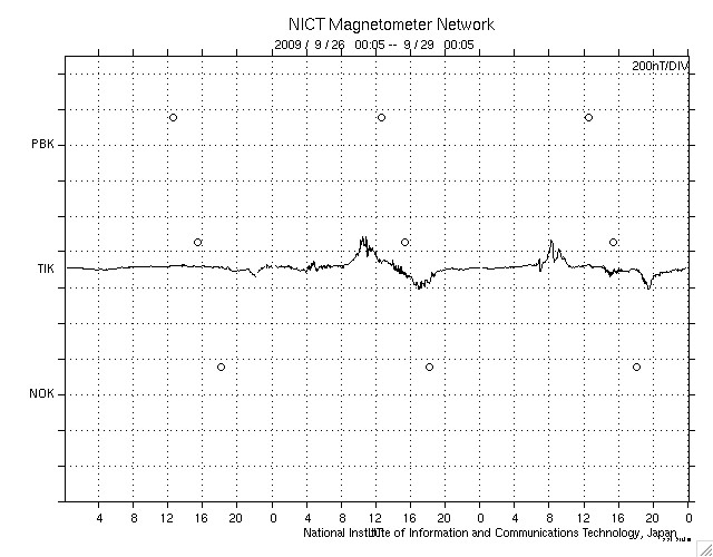 2009/ 9/29 09:06 更新 太陽風は、300km/秒台前半と低速です。明後日に速度変化が起こりそうです。 担当 篠原 300km/秒台前半の速度の遅い太陽風が続いています。 ACEの観測によると、昨日の午後、28日15時(世界時28日6時)頃、 太陽風に小規模の変化が起こりました。 磁場強度が2nTから5nT強くらいにやや強まり、 速度が310km/秒から340km/秒に少し上昇し、 密度は10個/cm^3から2個/cm^3ほどに減少しています。 太陽にはコロナホールの分布が見られましたから、 それらの影響が及んでいるのかもしれません。 磁場が強まった頃に、南北成分が-5nTほどのまとまった南向きになりました。 その影響で、AE指数1000nTと大きめのオーロラ活動が発生しています。 ただ、昨日のデータにもありましたが、 太陽風の数値以上に大きな変化のようにも感じられます。 SOHOのサイトが再開されています。 EIT195を見ると、北極からコロナホールが細長く下がって来ています。 ちょうど太陽の中心線を通過したところです。 このコロナホールは前周期にもあり、27日周期の図の9月4日の太陽風の変化をもたらしました。 今周期は、明後日の10月1日頃と予想されます。 コロナホールの東西の幅がかなり狭いので、影響は短時間で終わるでしょう。 太陽では、北半球の西側(右側)に、1027黒点群が見えています。 南半球側の1026黒点群は、白斑の左側に小さな黒点があるようにも見えます。 X線グラフでは、活動度は低く穏やかな状態です。 SOHO EIT195による、太陽コロナの様子。29日9時(世界時29日0時)。 (c) SOHO (ESA & NASA) ![]() SOHOによる太陽の可視光写真。北半球西寄りに1027黒点群が見えています。 (c) SOHO (ESA & NASA) ![]() ACEが観測した太陽風の磁場(1番上の枠、白線は全体の強度、赤線は南北成分) および、太陽風の密度(3番目の橙線)、速度(4番目の黄線) (c) NOAA/SWPC ![]() リアルタイムAE指数 下段のAEグラフの値が高くなると、オーロラ活動が活発化しています。 (c) 京都大学, NICT ![]() シベリアで観測された3日間の磁場データ 右側の3分の1が、昨日のデータになります。グラフが上がったり下がったりすると、オーロラ活動が活発化しています。 (c) NICT ![]() 27日の太陽周期に合わせたデータプロット 太陽が同じ面を地球に向けていた27日前の変化から、今後を予想することができます。 (c) NICT
