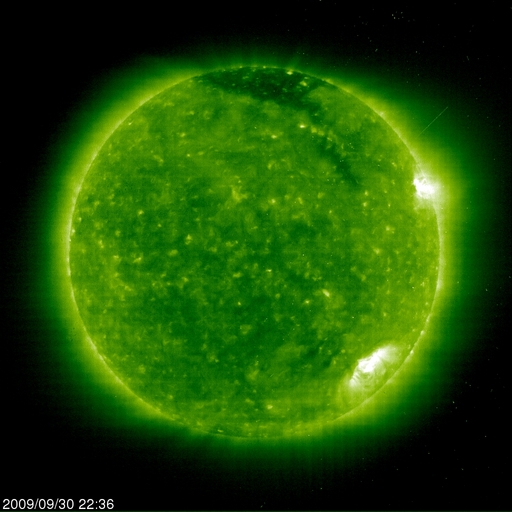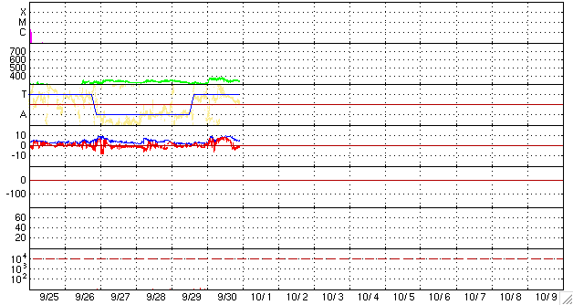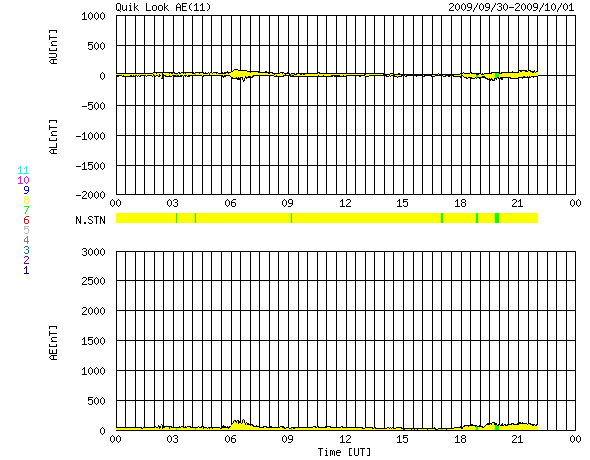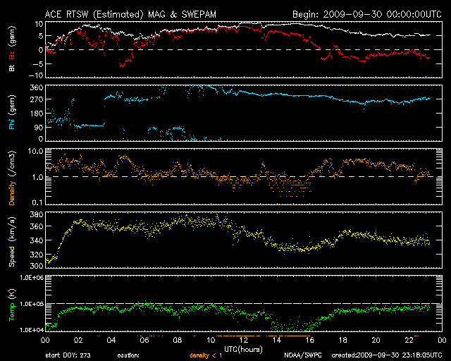 2009/10/ 1 08:19 更新 太陽風の速度が少し上がりましたが、低速風が続いています。磁気圏も静かです。 担当 篠原 昨日のニュースの直後から、太陽風の磁場強度が5〜10nTレベルに強まり、 速度も360km/秒と小幅ですが上昇しました。 予想よりも早い変化の発生でしたが、コロナホールの位置から見ると、 一番濃い部分からの影響としては到来が早すぎる様に感じられます。 太陽風の変化は、引き続き発生する可能性があります。 現在の磁場強度は、5nTと落ち着き気味ですが、 今日もこのまま注目して下さい。 太陽風の磁場強度が強まりましたが、南北成分が概ね北寄りだったため、 磁気圏への影響はほとんど見られませんでした。 AE指数は静穏です。 この後、速度が上がり、磁場が南を向く様になると、 オーロラの活動も強まることが期待できます。 太陽では、1027黒点群が西の端に沈みつつあります。 今日の写真では、かろうじて黒点を見つけられるくらいに小さくなってしまいました。 しかし、X線のグラフでは、Aクラスの変化が活発に見られています。 小さな変化ですが、活動度は多少上がっているようです。 SOHO EIT195による、太陽コロナの様子。10月1日7時半(世界時30日22時半)。 (c) SOHO (ESA & NASA) ![]() SOHOによる太陽の可視光写真。1027黒点群は西の端に没しつつあります。 (c) SOHO (ESA & NASA) ![]() ACEが観測した太陽風の磁場(1番上の枠、白線は全体の強度、赤線は南北成分) および、太陽風の密度(3番目の橙線)、速度(4番目の黄線) (c) NOAA/SWPC ![]() リアルタイムAE指数 下段のAEグラフの値が高くなると、オーロラ活動が活発化しています。 (c) 京都大学, NICT ![]() シベリアで観測された3日間の磁場データ 右側の3分の1が、昨日のデータになります。グラフが上がったり下がったりすると、オーロラ活動が活発化しています。 (c) NICT ![]() 27日の太陽周期に合わせたデータプロット 太陽が同じ面を地球に向けていた27日前の変化から、今後を予想することができます。 (c) NICT