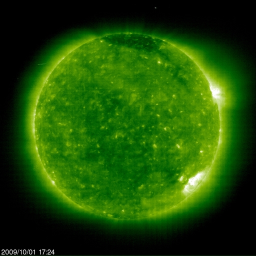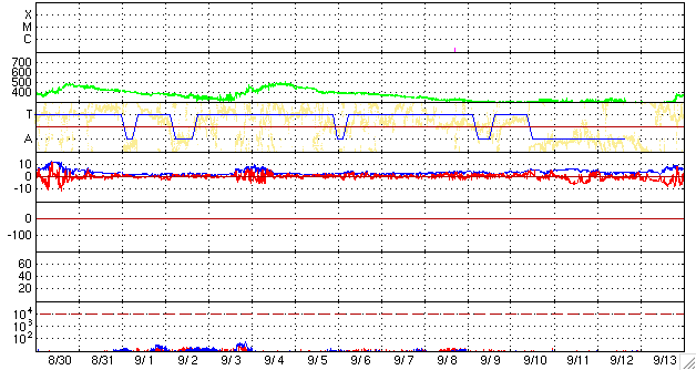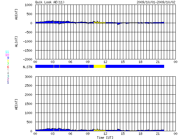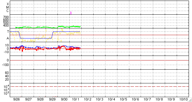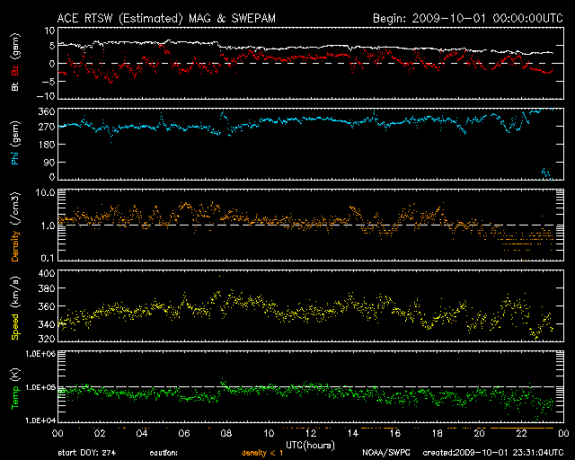 2009/10/ 2 08:32 更新 太陽風は速度が低いままです(350km/秒)。これから10日程度、静かに推移しそうです。 担当 篠原 昨日より、太陽風の速度はほとんど変化していません。 350km/秒付近と低速の状態で安定してます。 また、磁場強度は5nTから3nTに弱まりました。 結局、太陽風速度の高まりは来ませんでした。 27日周期の図で、前周期の変化と比較して下さい。 前周期(9月4-5日)の速度の高まりも、規模は小さいものでしたが、 今周期は、これが完全に消えてしまい、平坦になってしまいました。 9月30日に見えた磁場強度の強まりは、高速風領域の名残りだった様です。 昨日より、磁気圏も全く静穏です。 AE指数は、全く平坦です。 この後、10日間程度静穏な日が続くと思われます。 今日の27日周期の図では、前周期の右端、9月13日に小さな速度の段差があります。 これに続く速度の高まりが、今のところ予想される次の擾乱です。 発生源のコロナホールは、もうしばらく待たないと見えて来ません。 とは言っても、前周期の速度の高まりも、 500km/秒には届かなかった程度の変化でしたので、 今周期に回帰して来るかどうか、待ってみるしかありません。 太陽では、昨日のお昼頃、1日12時(世界時1日3時)に、 1027黒点群でB7の小さなフレアが発生しました。 1027黒点群は、もう太陽の向こう側に回ってしまいましたが、 最後のところで、元気を取り戻していた様です。 この後の様子は、STEREO AheadのEUVI195で追いかけることもできます。 SIDCでは、9月の黒点数が発表されています。 それによると、9月の無黒点の日数は、19日でした。 20日台を割ったのは、昨年の11月以来です。 8月に今季最高を記録したばかりですし、 今月下がったところで、すぐに何かが分かる訳ではありません。 引き続き、変化を注目して下さい。 いつもの表、グラフは後ほど掲載します。 SOHO EIT195による、太陽コロナの様子。10月2日2時半(世界時1日17時半)。 (c) SOHO (ESA & NASA) ![]() SOHOによる太陽の可視光写真。1027黒点群は西の端に沈みました。 (c) SOHO (ESA & NASA) ![]() ACEが観測した太陽風の磁場(1番上の枠、白線は全体の強度、赤線は南北成分) および、太陽風の密度(3番目の橙線)、速度(4番目の黄線) (c) NOAA/SWPC ![]() リアルタイムAE指数 下段のAEグラフの値が高くなると、オーロラ活動が活発化しています。 (c) 京都大学, NICT ![]() シベリアで観測された3日間の磁場データ 右側の3分の1が、昨日のデータになります。グラフが上がったり下がったりすると、オーロラ活動が活発化しています。 (c) NICT ![]() 27日の太陽周期に合わせたデータプロット 太陽が同じ面を地球に向けていた27日前の変化から、今後を予想することができます。 (c) NICT