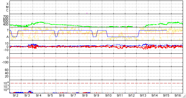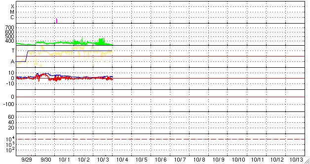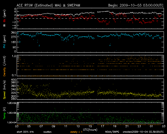 - 2009/10/ 3 11:10 低速の太陽風が続いています。磁気圏も静穏です。