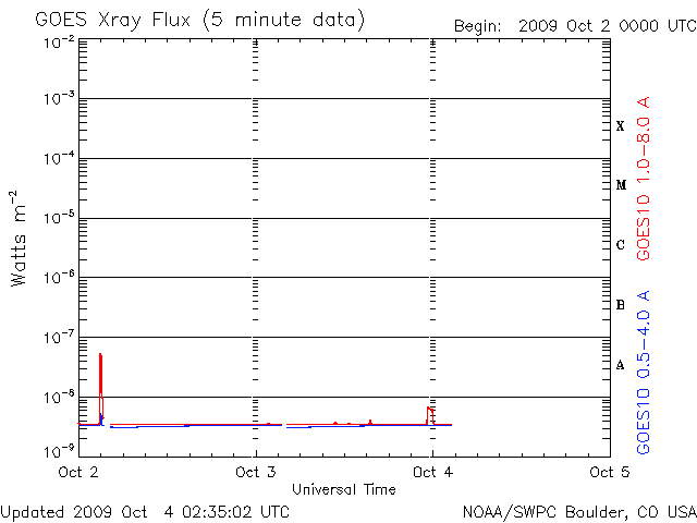 - 2009/10/ 2 08:32 太陽風は速度が低いままです(350km/秒)。これから10日程度、静かに推移しそうです。
