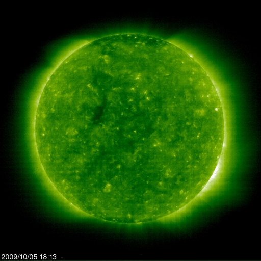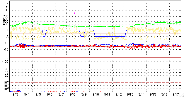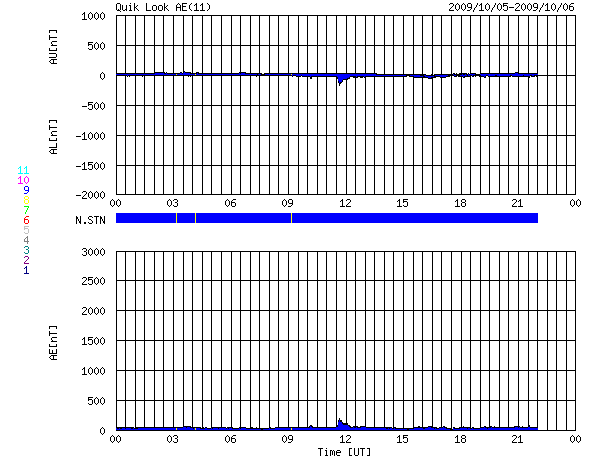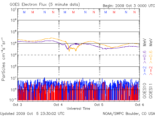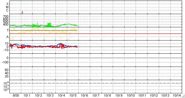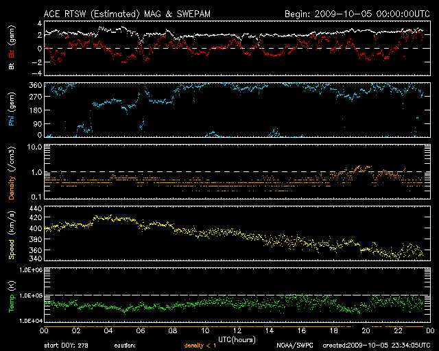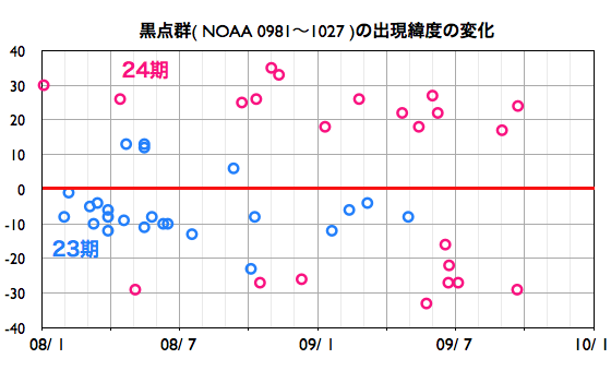 作り始めた頃は、こんなに長引くとは思いもしなかったのですが、 モニターサイズによっては、既に画面をはみ出しているのかもしれません。 また、この推移を図の1枚目に掲載します。 これを見ると、昨年の7月頃から、無黒点日は20日と30日の間を行き来している様です。 今回、振れ幅がぐっと大きくなりましたが、 長い目で見ると、これまでの変化の幅の中に入っているとも言えます。 9月末には、1026群、1027群というふたつの黒点群が太陽の中で存在感を見せていました (黒点の規模としては、小さかったのですが)。 このような黒点群が今後どのような頻度で出現するのか、 その様子を見ていることで、 これからの太陽の変化が感じられるのではないかと思います。 また、2枚目の図は、黒点群の出現緯度です。 もう、太陽の活動周期は、すっかり24期に変わったと言えるでしょう。 1026、1027群(右端の2つの◯)は、 北半球、南半球のそれぞれ中緯度付近に出現しています。 24期の黒点群がこのあたりに現れることは、もう普通のことになっています。 先月も書きましたが、今後の焦点は、黒点の出現頻度が高まるのかどうか、 ということだと思います。 昨日、400km/秒まで高まっていた太陽風の速度は、 昨日の昼過ぎから低下が始まり、現在は360km/秒の低速風に戻っています。 太陽風の磁場強度も2nT近くに下がっていて、弱まった状態です。 磁気圏もとても穏やかです。 AE指数は、全く変化していません。 穏やかな太陽風は、今週いっぱい続きます。 次の速度の高まりは(たいした規模ではありませんが)、 10月11-12日頃に始まると予想していますが、 その発生源に相当すると思われるコロナホールが、 SOHO EIT195の太陽の中心やや東(左)に見えています。 前周期のコロナホールは、これに続く様にもう少し左へと伸びていたのですが、 そのあたりは、2-3日後くらいに見えて来るでしょう。 太陽は無黒点で、X線にも変化はなく、 とても静かです。 2006年7月以降の、月ごとの無黒点日数の変化。 (c) 作図 : 宇宙天気ニュース、データ : SIDC ![]() 2008年1月以降に出現した太陽黒点の緯度の変化。 (c) 作図 : 宇宙天気ニュース、データ : NOAA ![]() SOHO EIT195による、太陽コロナの様子。6日3時(世界時5日18時)。 (c) SOHO (ESA & NASA) ![]() ACEが観測した太陽風の磁場(1番上の枠、白線は全体の強度、赤線は南北成分) および、太陽風の密度(3番目の橙線)、速度(4番目の黄線) (c) NOAA/SWPC ![]() リアルタイムAE指数 下段のAEグラフの値が高くなると、オーロラ活動が活発化しています。 (c) 京都大学, NICT ![]() シベリアで観測された3日間の磁場データ 右側の3分の1が、昨日のデータになります。グラフが上がったり下がったりすると、オーロラ活動が活発化しています。 (c) NICT ![]() 27日の太陽周期に合わせたデータプロット 太陽が同じ面を地球に向けていた27日前の変化から、今後を予想することができます。 (c) NICT