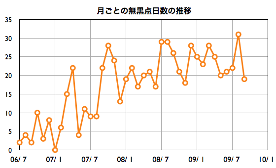 2009/10/ 6 08:35 更新 太陽風は低速風に戻りました(360km/秒)。9月までの黒点数の状況をまとめます。 担当 篠原 SIDCが発表した9月の黒点数データより、 9月の無黒点日数は、19日でした。 前月である8月に、1ヶ月間連続の31日という今極小期最高値を記録したのですが、 その翌月は、約1年ぶりに20日台を割ることになりました。 2006年11月以降の、各月の無黒点日数の表です。