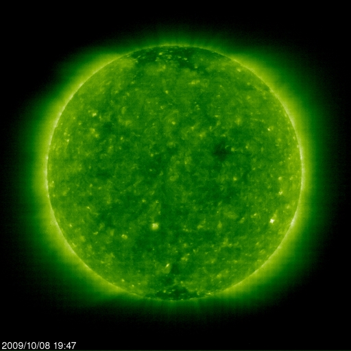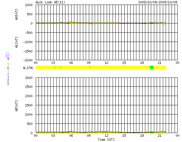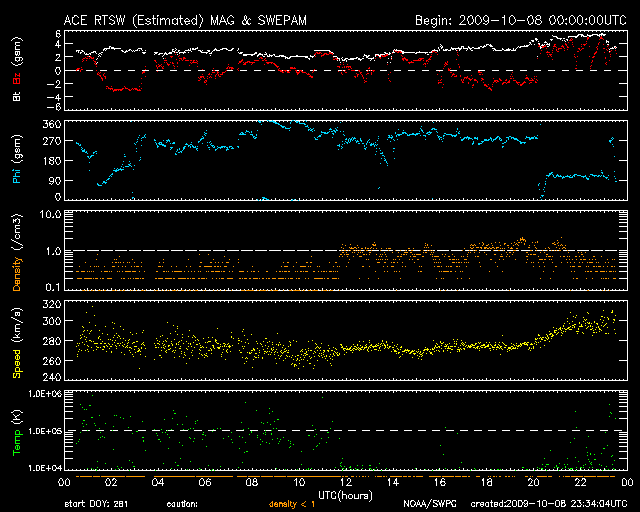 2009/10/ 9 08:34 更新 280km/秒前後のかなり遅い太陽風が続いています。磁気圏もとても静かです。 担当 篠原 かなり速度の遅い太陽風が続いています。 昨日、300km/秒台を割っていた速度は、そのまま270km/秒近くまで下がりました。 今朝になってほんの少し上がって、290km/秒となり、 磁場強度も、やや弱めの3nTから、平均レベルの5nTへと少し高まっています。 前周期に見られた速度上昇の回帰としては、まだ少し早い様に思われますので、 ここから大きく速度が上がることはなく、 明日くらいまでは、低速の太陽風が続くのではないかと思います。 磁気圏もとても静かです。 AE指数は、今日も全く変化していません。 SOHO EIT195の太陽コロナ写真では、小さなコロナホールが西へ移動しています。 今日の写真でも、ここから東側に伸びるコロナホールの筋は見られず、 前周期に見えていたコロナホールは、ほとんど消えてしまった様です。 上に書いた、速度上昇の回帰は、今回はほとんど見られないかもしれません。 太陽は無黒点が続き、とても穏やかです。 STEREO Behindで先回りすると、太陽の東端の向こう側に、 小規模ですが活動的な領域が発生しています。 黒点があるかどうかは微妙な大きさです。 もう3日ほどすると、SOHOでも見えてくるでしょう。 SOHO EIT195による、太陽コロナの様子。9日5時(世界時8日20時)。 (c) SOHO (ESA & NASA) ![]() ACEが観測した太陽風の磁場(1番上の枠、白線は全体の強度、赤線は南北成分) および、太陽風の密度(3番目の橙線)、速度(4番目の黄線) (c) NOAA/SWPC ![]() リアルタイムAE指数 下段のAEグラフの値が高くなると、オーロラ活動が活発化しています。 (c) 京都大学, NICT ![]() シベリアで観測された3日間の磁場データ 右側の3分の1が、昨日のデータになります。グラフが上がったり下がったりすると、オーロラ活動が活発化しています。 (c) NICT ![]() 27日の太陽周期に合わせたデータプロット 太陽が同じ面を地球に向けていた27日前の変化から、今後を予想することができます。 (c) NICT