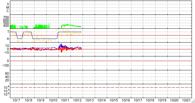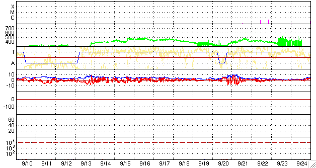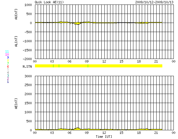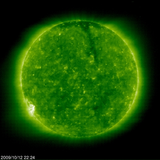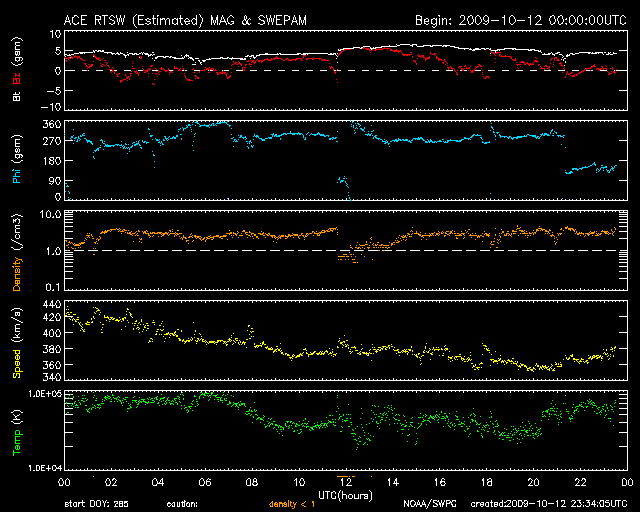 2009/10/13 08:35 更新 太陽風の速度は、370km/秒に下がっています。磁気圏も静かです。 担当 篠原 太陽風の速度上昇は、昨日のニュースの頃までが最高速だった様で、 その後低下を始め、既に370km/秒の低速風に戻っています。 磁場強度は、逆にやや強さを戻して、5nTと平均的な強度で安定しています。 南北成分は、0nT付近から北寄りに推移していて、磁気圏への影響は小さそうです。 実際、AE指数を見るとほとんど変化は見られず、磁気圏はとても静かだった様です。 太陽風の速度上昇領域はあっさりと通過して、 これから再び低速風が続くことになりそうです。 SOHO EIT195の太陽コロナ写真では、北極から低緯度域まで、 垂れ下がる様な細長いコロナホールの筋が見えています。 目立つ形をしていますが、地球への影響は小さいでしょう。 太陽コロナは全体的にのっぺりとしていて、当分穏やかな太陽風が続きそうです。 また、EIT195の太陽の南東(左下)の端に、明るい領域が見えています。 STEREO Behindで見えていた活動領域が、こちら側に回って来たのです。 しかし、可視光写真を見ると白斑が光っているだけで、黒点は無い様です。 X線データも特に目立った変化はしていません。 太陽は静穏な状態を保っています。 SOHO EIT195による、太陽コロナの様子。13日7時半(世界時12日22時半)。 (c) SOHO (ESA & NASA) ![]() SOHOによる太陽の可視光写真。太陽の南東に白斑が見えます。 (c) SOHO (ESA & NASA) ![]() ACEが観測した太陽風の磁場(1番上の枠、白線は全体の強度、赤線は南北成分) および、太陽風の密度(3番目の橙線)、速度(4番目の黄線) (c) NOAA/SWPC ![]() リアルタイムAE指数 下段のAEグラフの値が高くなると、オーロラ活動が活発化しています。 (c) 京都大学, NICT ![]() シベリアで観測された3日間の磁場データ 右側の3分の1が、昨日のデータになります。グラフが上がったり下がったりすると、オーロラ活動が活発化しています。 (c) NICT ![]() 27日の太陽周期に合わせたデータプロット 太陽が同じ面を地球に向けていた27日前の変化から、今後を予想することができます。 (c) NICT