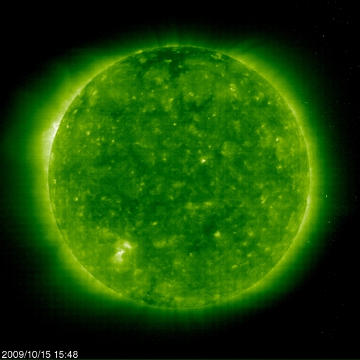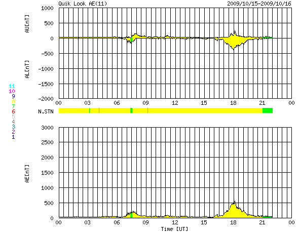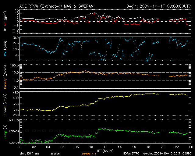 2009/10/16 08:31 更新 太陽風の速度が430km/秒まで上昇しています。 担当 篠原 太陽風の予想が当たったようです。 昨日、15日14時(世界時15日5時)頃から、 太陽風の磁場強度(ACEの白線)、プラズマ密度(橙色線)、 速度(黄色線)それぞれに変化が始まりました。 磁場強度は10nT、密度は10個/cm^3くらいまで強まり、 速度は遅れて上昇し、430km/秒くらいまで上がっています。 高速風というほどではありませんが、小規模の速度の高まりとなっています。 現在、磁場強度、密度は既に下がっていて、速度の上昇もこのあたりまででしょう。 磁場強度が強まって、オーロラ活動の期待もあったのですが、 南北成分(赤線)は北向きが中心でした。 部分的に南を向いたところで、AE指数500nTの中規模活動が1回だけ発生しています。 発生源のコロナホールは小規模でしたから、 太陽風速度の高まりは今日いっぱいくらいで終わって行くでしょう。 その後は、再び低速の太陽風が続きそうです。 SOHO EIT195の太陽コロナは、全体的にのっぺりとしていて、 STEREO Behindに見えているコロナホールは、まだ見つけることができません。 太陽は、今日も無黒点です。 こちらも、まだ続きそうです。 SOHO EIT195による、太陽コロナの様子。16日1時(世界時15日16時)。 (c) SOHO (ESA & NASA) ![]() SOHOによる太陽の可視光写真。南東の白斑は見にくくなっています。 (c) SOHO (ESA & NASA) ![]() ACEが観測した太陽風の磁場(1番上の枠、白線は全体の強度、赤線は南北成分) および、太陽風の密度(3番目の橙線)、速度(4番目の黄線) (c) NOAA/SWPC ![]() リアルタイムAE指数 下段のAEグラフの値が高くなると、オーロラ活動が活発化しています。 (c) 京都大学, NICT ![]() シベリアで観測された3日間の磁場データ 右側の3分の1が、昨日のデータになります。グラフが上がったり下がったりすると、オーロラ活動が活発化しています。 (c) NICT ![]() 27日の太陽周期に合わせたデータプロット 太陽が同じ面を地球に向けていた27日前の変化から、今後を予想することができます。 (c) NICT