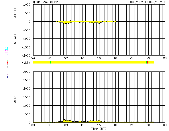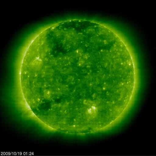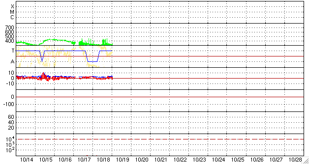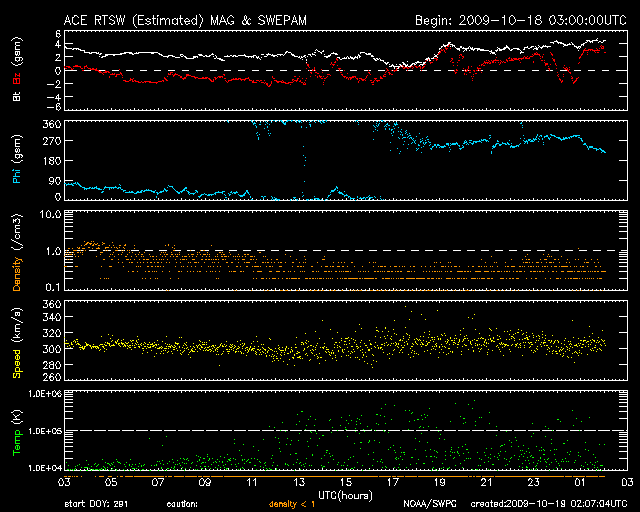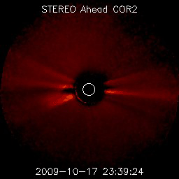 2009/10/19 11:06 更新 小規模のCMEが観測されました。太陽風は低速で(300km/秒)、磁気圏も概ね静穏です。 担当 篠原 昨日の記事に書いた、18日5時(世界時17日20時)のコロナの噴出は、 STEREO Aheadによって、CME(太陽ガスの放出現象)として観測されました。 その動画を掲載します。 STEREO Aheadは、太陽−地球間を横から見ています。 左に向かって飛び出している太陽のガスの進行方向に、地球があるのです。 このCMEは、SOHOのLASCO C2でもとても微かに見えています。 明後日の21日か、翌22日くらいに影響がやってきそうです。 速度はそれほど変化しないと思いますが、磁場がまとまった変化をするかもしれません。 その場合、強い南向きが続くと、オーロラ活動も活発化します。 アラスカのライブカメラなどで、期待してみましょう。 現在の太陽風は、速度300km/秒とかなり低速になっています。 磁場強度も、3nTと弱めが続いていましたが、 ACEの図の最後のところで4nTくらいに少し上がっています。 磁気圏も概ね静穏です。 太陽風磁場がしばらく弱い南向きになっていたため、 とても小さなオーロラ活動が発生した様です。 AE指数に、100nTほどの変化が見られます。 SOHO EIT195では、しばらく前から注目していたコロナホールが、ようやく見えて来ました。 南北両半球の中緯度付近にそれぞれ見えています。 南北対称に位置している様に見えて、面白いです。 もう1〜2日で太陽の中心線に達しそうです。 すると、地球への影響は、4〜5日後くらいになりそうです。 太陽は、黒点は無いままで、静かです。 STEREO AheadのCOR2カメラによる、CMEの様子。CMEの進行方向に地球があります。 (c) NASA ![]() SOHO EIT195による、太陽コロナの様子。19日10時半(世界時19日1時半)。 (c) SOHO (ESA & NASA) ![]() SOHOによる太陽の可視光写真。黒点はありません。 (c) SOHO (ESA & NASA) ![]() ACEが観測した太陽風の磁場(1番上の枠、白線は全体の強度、赤線は南北成分) および、太陽風の密度(3番目の橙線)、速度(4番目の黄線) (c) NOAA/SWPC ![]() リアルタイムAE指数 下段のAEグラフの値が高くなると、オーロラ活動が活発化しています。 (c) 京都大学, NICT ![]() シベリアで観測された3日間の磁場データ 右側の3分の1が、昨日のデータになります。グラフが上がったり下がったりすると、オーロラ活動が活発化しています。 (c) NICT ![]() 27日の太陽周期に合わせたデータプロット 太陽が同じ面を地球に向けていた27日前の変化から、今後を予想することができます。 (c) NICT