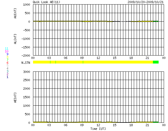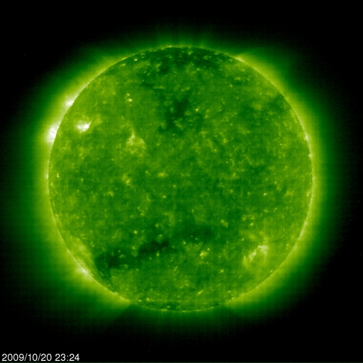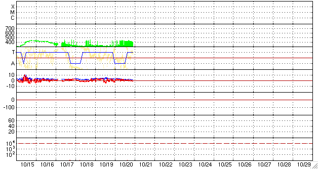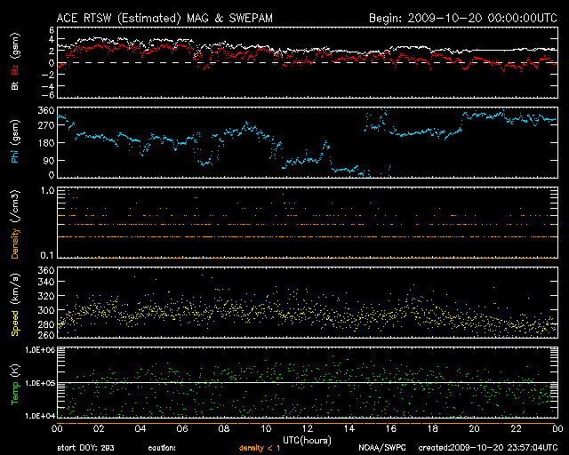 2009/10/21 08:57 更新 速度280km/秒とかなり遅い太陽風になっています。とても小さな1028黒点群が発生しました。 担当 篠原 太陽風の速度は、300km/秒から、280km/秒へ更に下がり、 かなり低速の風になっています。 プラズマ密度も少なくなっていて、速度データにばらつきが目立っています。 また、磁場強度も2nTへ弱まっていて、全てにわたって弱々しい太陽風です。 その上、磁場の南北成分は北寄りで推移しています。 こうなると、オーロラ活動はほとんど期待できず、AE指数は完全に平坦です。 昨日も書いた様に、太陽で発生した小規模のCMEの影響が これからやって来る可能性があります。 引き続き注目して下さい。 また、SOHO EIT195では、太陽の南北に見えるコロナホールが、 太陽の中心線を越えて西半球側にせり出して来ました。 こちらの影響も、3日後くらいに到来する可能性があります。 可能性があると弱めの表現にしているのは、 南北にダブルであるものの、どちらも緯度がやや高めであるためか、 前周期の太陽風にはほとんど影響が見られなかったからです。 27日周期の図で前周期を見ると、コロナホールの影響らしい変化は、 9月26日以降の磁場強度の強まりくらいでした。 今周期はどのように推移するでしょうか。 太陽では、北半球の東端付近に、1028黒点群が発生したそうです。 SOHOの可視光写真を見ると、かろうじて黒い点が見えている様です。 ただし、ニュース時点の最新写真(掲載分の12時間後)では、既に見えなくなっています。 SOHO EIT195による、太陽コロナの様子。21日8時半(世界時20日23時半)。 (c) SOHO (ESA & NASA) ![]() SOHO MDIによる、太陽可視光写真。北東(左上)に、微かに1028黒点群が出現しました。 (c) SOHO (ESA & NASA) ![]() ACEが観測した太陽風の磁場(1番上の枠、白線は全体の強度、赤線は南北成分) および、太陽風の密度(3番目の橙線)、速度(4番目の黄線) (c) NOAA/SWPC ![]() リアルタイムAE指数 下段のAEグラフの値が高くなると、オーロラ活動が活発化しています。 (c) 京都大学, NICT ![]() シベリアで観測された3日間の磁場データ 右側の3分の1が、昨日のデータになります。グラフが上がったり下がったりすると、オーロラ活動が活発化しています。 (c) NICT ![]() 27日の太陽周期に合わせたデータプロット 太陽が同じ面を地球に向けていた27日前の変化から、今後を予想することができます。 (c) NICT