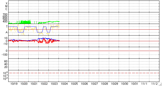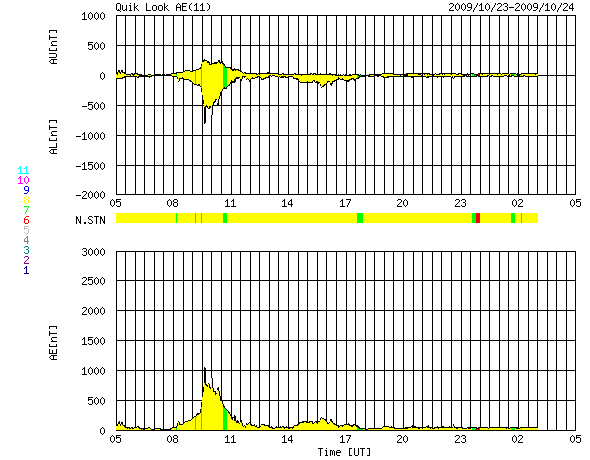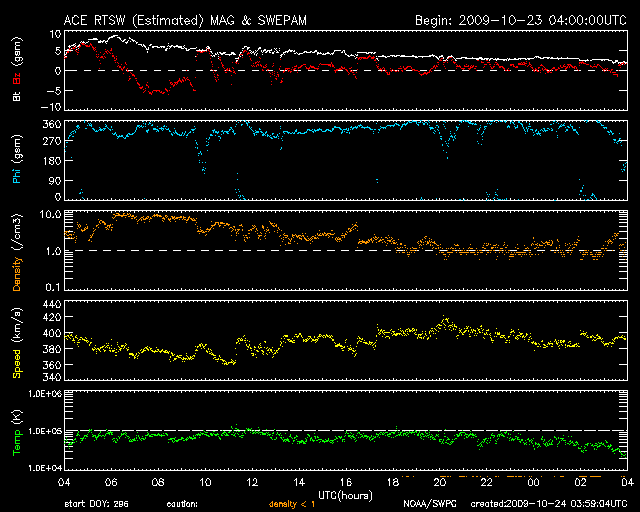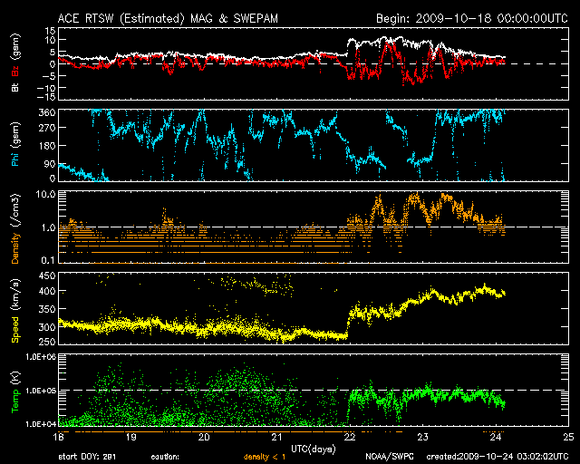 2009/10/24 13:00 更新 CMEによる太陽風の変動は終わりつつあります。次はコロナホールの影響です。1029黒点群が出現しました。 担当 篠原 昨日のニュースの後、太陽風の速度は400km/秒まで上がりました。 一方、磁場強度は5nTを割り、現在は2nTくらいに弱まっています。 昨夜も、太陽風の変動の影響で、活発なオーロラ活動が発生しました。 AE指数で800nT、瞬間的に1000nTに達する、大きめの中規模活動が観測されています。 しかし、昨日のAE指数の図と違って、その前後はだいぶ静かです。 太陽風の速度は高まったものの、 磁場強度が弱まるとともに、北寄りの傾向に変わってしまったことが影響しています。 今日の1枚目の図は、7日幅の太陽風のデータです。 この2日間に発生した太陽風の乱れの全体像がよく見えています。 今回は、特に磁場の変化に注目して下さい。 太陽風の乱れの到来とともに、強度(白線)が10nTレベルにぐっと上昇し、強い状態が丸1日続きます。 その後、次第に弱まり、現在は磁場の乱れはほぼ終わっています。 その間、磁場の南北成分(赤線)は、 大きく波を打つ様に南(マイナス)、北(プラス)と大きな振幅で変化しています。 この大きな南向きの波が活発なオーロラ活動をもたらしたのです。 南北成分の変動は、大きく2回揺れている様にも見えます。 続けて2度発生したCMEの噴出現象が、こうして一体化してやって来たのかもしれません。 CME起源の変動は終わりつつあります。 一方、コロナホールの影響がこれから始まるかもしれません。 太陽風の速度、磁場、それぞれどのように変化して行くのか、この週末も注目されます。 太陽では、1029黒点群が急に発生しました。 SOHO EIT195を見ると、昨日はまだぼんやりとしか光っていない部分が、 今日はしっかりと輝く様になり、黒点も発生させたのです。 X線のデータはそれほど変化しておらず、フレア活動としてはあまり活発ではないのかもしれません。 これから更に発達して行くのかどうか、注目して下さい。 ACE衛星による7日間の太陽風。速度は黄色、磁場強度は白色、南北成分は赤色。 (c) NOAA/SWPC ![]() SOHO EIT195による、太陽コロナの様子。23日5時(世界時22日20時)。 (c) SOHO (ESA & NASA) ![]() SOHO MDIによる、太陽可視光写真。東端に白斑が見えます。 (c) SOHO (ESA & NASA) ![]() ACEが観測した太陽風の磁場(1番上の枠、白線は全体の強度、赤線は南北成分) および、太陽風の密度(3番目の橙線)、速度(4番目の黄線) (c) NOAA/SWPC ![]() リアルタイムAE指数 下段のAEグラフの値が高くなると、オーロラ活動が活発化しています。 (c) 京都大学, NICT ![]() シベリアで観測された3日間の磁場データ 右側の3分の1が、昨日のデータになります。グラフが上がったり下がったりすると、オーロラ活動が活発化しています。 (c) NICT ![]() 27日の太陽周期に合わせたデータプロット 太陽が同じ面を地球に向けていた27日前の変化から、今後を予想することができます。 (c) NICT