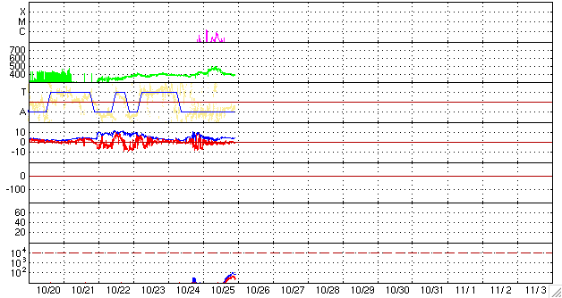 2009/10/26 08:20 更新 1029黒点群が小規模のフレア活動を起こしています。太陽風も小規模の高速風が来ています。 担当 篠原 太陽から地球まで、それぞれの活動規模は小さいのですが、 にぎやかな状態になっています。 太陽では、昨日のニュースの頃、25日11時(世界時25日2時)に、 C1.5の小規模フレアが発生しました。 発生したのは1029黒点群で、 ここでは、その前後にもBクラスの小さな活動を何度も起こしています。 しかし、GOESのX線グラフを見ると、 X線の強度が高くなって、1029群が活動的だったのは昨日までで、 現在は、強度が下がって来ています。 今後は、フレアは起きないのかもしれません。 ただし、黒点群のフレア活動は、強まったり弱まったりをくりかえすことも多いので、 1029群がこれからどうなるのかは、引き続き注目する必要があります。 昨日は、太陽風も25日17時(世界時25日8時)頃に500km/秒まで高まる変化を見せました。 太陽風磁場は5nTと平均的な強さで安定しています。 このなかで、磁場の南北成分が弱いながらも-1〜-2nTの南向きをずっと続けていました。 このため、磁気圏のオーロラ活動も、 強くはありませんがAE指数で300nTくらいの小規模変動が連続的に発生しました。 アラスカのライブカメラ(Live! オーロラ)では、 日本時間の夜の間ずっときれいなオーロラの帯が見えていました。 現在の太陽風の強まりは、 SOHO EIT195に見えるコロナホールの影響がやって来ているのだと思われます。 これ以上の大きな変化にはならないでしょうが、 影響自体はもう2日程度続く可能性があります。 もうしばらく、やや活発なオーロラを楽しむチャンスが続きそうです。 SOHO EIT195による、太陽コロナの様子。26日7時半(世界時25日22時半)。 (c) SOHO (ESA & NASA) ![]() SOHOによる、太陽可視光写真。1029黒点群が見えています。 (c) SOHO (ESA & NASA) ![]() GOES衛星の太陽X線データ (c) NOAA/SWPC ![]() ACEが観測した太陽風の磁場(1番上の枠、白線は全体の強度、赤線は南北成分) および、太陽風の密度(3番目の橙線)、速度(4番目の黄線) (c) NOAA/SWPC ![]() リアルタイムAE指数 下段のAEグラフの値が高くなると、オーロラ活動が活発化しています。 (c) 京都大学, NICT ![]() シベリアで観測された3日間の磁場データ 右側の3分の1が、昨日のデータになります。グラフが上がったり下がったりすると、オーロラ活動が活発化しています。 (c) NICT ![]() 27日の太陽周期に合わせたデータプロット 太陽が同じ面を地球に向けていた27日前の変化から、今後を予想することができます。 (c) NICT