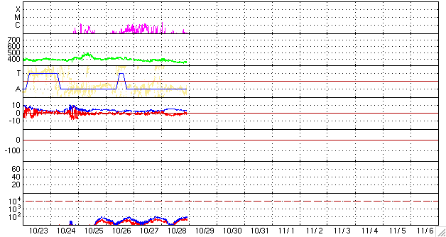 2009/10/29 09:14 更新 1029黒点群の活動は少し落ち着いています。太陽風は低速で、概ね静穏です。 担当 篠原 太陽観測衛星「ひので」による、1029黒点群の拡大写真が公開されています。 縮小した全体写真と、オリジナルの解像度で一部を切り取った写真を掲載します。 一昨日に撮影されたものです。 黒点の複雑な姿がよく見えています。 ひのでのページへ行くと、全体像をオリジナルの解像度で見ることができます。 上記のサイトで、黒点写真をクリックしてください。 すごい迫力です。 (パソコンが画面に合わせて縮小表示することがありますので、注意してください) その1029黒点群ですが、やや勢いを無くしているようです。 昨日のニュース以降は、発行直後にC2.2の小規模フレアを起こしただけで、 X線のグラフは強度が下がるとともに、 小さなフレア活動による、とがった変化も見られなくなっています。 磁場構造の複雑さは保っている様なので、再び活動が強まる可能性はあります。 一方、次第に西の端に近づいているので、 CMEなどで地球へ影響を及ぼす可能性は低くなっています。 太陽風は、速度は350km/秒に下がり、更に低速風となっています。 磁場強度は4〜5nTと平均的な強さにもどっていて、しかも南北成分がずっと南を向いていました。 振幅は-2nTと小さく、速度も低かったため、地球への影響は限定的です。 AE指数では、200nTくらいの小さな変動が発生している程度です。 磁場が長時間南向きだったことを反映して、 AE指数の変化も長時間続いているのが特徴的です。 この後も、基本的には太陽風は低速の状態が続くと思われます。 26日夜に発生した小さな爆発の影響が、明日くらいにかけてやって来るかもしれません。 ひのでが撮影した1029黒点群。10月27日19時(世界時27日11時)。 (c) 国立天文台/JAXA ![]() ひのでによる1029黒点群の拡大写真。 (c) 国立天文台/JAXA ![]() SOHO EIT195による、太陽コロナの様子。29日9時(世界時29日0時)。 (c) SOHO (ESA & NASA) ![]() SOHOによる、太陽可視光写真。1029黒点群は西の端に近づいています。 (c) SOHO (ESA & NASA) ![]() GOES衛星の太陽X線データ (c) NOAA/SWPC ![]() ACEが観測した太陽風の磁場(1番上の枠、白線は全体の強度、赤線は南北成分) および、太陽風の密度(3番目の橙線)、速度(4番目の黄線) (c) NOAA/SWPC ![]() リアルタイムAE指数 下段のAEグラフの値が高くなると、オーロラ活動が活発化しています。 (c) 京都大学, NICT ![]() シベリアで観測された3日間の磁場データ 右側の3分の1が、昨日のデータになります。グラフが上がったり下がったりすると、オーロラ活動が活発化しています。 (c) NICT ![]() 27日の太陽周期に合わせたデータプロット 太陽が同じ面を地球に向けていた27日前の変化から、今後を予想することができます。 (c) NICT