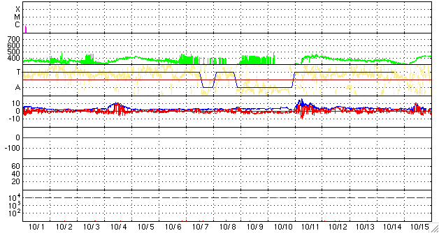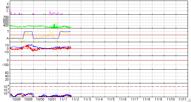 右側の3分の1が、昨日のデータになります。グラフが上がったり下がったりすると、オーロラ活動が活発化しています。