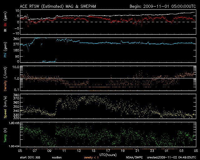 - 2009/10/30 09:35 太陽風の磁場が強まりましたが、北寄りだったため磁気圏は静穏です。1029黒点群は穏やかです。