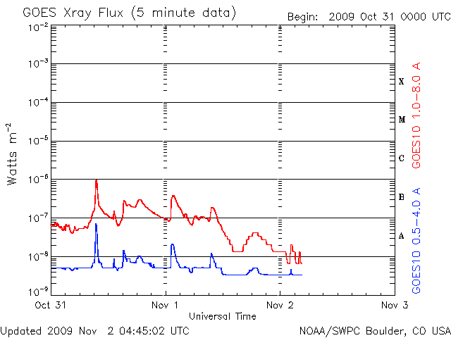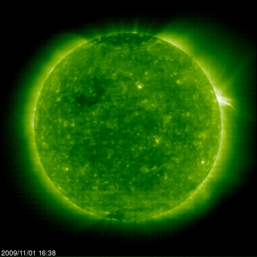 - 2009/11/ 1 08:06 1029黒点群が、太陽の西端でCクラスのフレアを起こしました。太陽風は低速で、地球も静穏です。