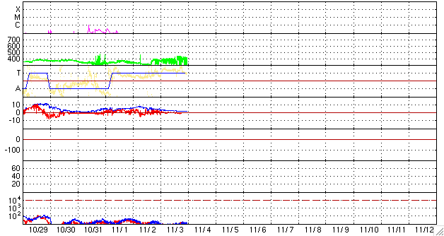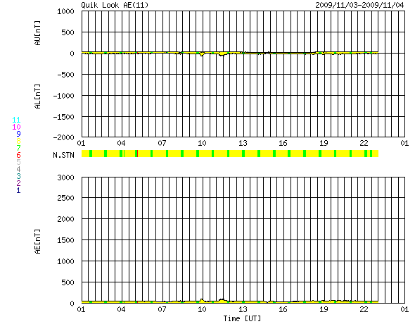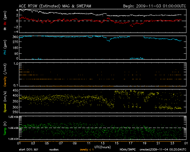 2009/11/ 4 09:20 更新 太陽風の密度が減少しています。速度は低速で、磁気圏も静穏です。 担当 篠原 SOHO衛星がキーホールという電波を受信しにくい位置に入ったのに合わせて、 EITカメラはBakeoutというメンテナンス作業を行っているようです。 そのため、EIT195などの写真の更新が停止しています。 そこで、STEREO Behindの写真を使って、太陽コロナの様子を調べましょう。 STEREO Behindは、地球からどんどん離れて行っていて、 太陽から見た地球と衛星の角度は、60度に達しています。 これは、太陽の自転周期で考えると4日半に相当します。 STEREO Behindからは、地球より4日半先の太陽を見ていることになるのです。 今日の1枚目の写真は、STEREO Behindの最新の太陽コロナ写真です。 すると、一昨日のニュースで太陽の北半球に見えていた淡いコロナホールは、 もう、太陽の西の端(右端)に接近しています。 これでは、ずいぶん太陽が進んでしまったようで、 地球の宇宙天気を検討するには使いにくい感じがします。 では、STEREO Behindの4日半前の写真を見てみましょう。 2枚目の写真は10月30日の太陽コロナです。 すると、北半球のコロナホールは、ちょうど太陽の中央線を通りすぎ、 西半球に迫り出したくらいに見えています。 すると、地球への高速風の影響は3日後くらいかなと、タイミングを予想するには便利な写真です。 コロナホールによる高速太陽風の回帰というような、 ゆっくりと状況が変化する現象を検討するのであれば、 こうやってSTEREO Behindのデータをさかのぼって、 地球から見た状態に相当する写真を調べるというのも有効な方法です。 現在の太陽風は、速度が300〜400km/秒と低速のあたりにあるようです。 あいまいな表現になっていますが、それは、プラズマの粒子密度がかなり減少していて、 速度データのエラーが大きくなっているためです。 昨日のニュースの直後くらいから、大きく減っています。 磁場強度は、2nTへ弱まっています。 南北成分は0nT付近で安定しており、地球への影響は小さくなっています。 そのため、オーロラの活動度を示すAE指数のグラフは、ほとんど変化していません。 穏やかな状態は、明日か明後日くらいまで続くのではないかと思います。 27日周期の予想では11月7日、もしくは少し早まって6日くらいに、 コロナホールの影響が太陽風に現れると思います。 前周期(10月11日)のように速度の遅い変動であれば、到来も遅めになり、 今回は速度が高まってるのであれば、到来は早まることになるでしょう。 こういった点にも注目しながら、今後の太陽風を見てください。 太陽は、無黒点で静穏です。 昨日の昼過ぎの撮影ですが、SOHOの可視光写真が更新されています。 キーホールでも、ある程度のデータのやり取りはできる様です。 STEREO Behindによる最新の太陽コロナ写真。地球よりも4日半先の太陽を見ています。 (c) NASA ![]() STEREO Behindによる4日半前の太陽コロナ。地球から見える太陽コロナは、このような状態です。 (c) NASA ![]() SOHOによる太陽可視光写真。太陽は無黒点です。 (c) SOHO (ESA & NASA) ![]() ACEが観測した太陽風の磁場(1番上の枠、白線は全体の強度、赤線は南北成分) および、太陽風の密度(3番目の橙線)、速度(4番目の黄線) (c) NOAA/SWPC ![]() リアルタイムAE指数 下段のAEグラフの値が高くなると、オーロラ活動が活発化しています。 (c) 京都大学, NICT ![]() シベリアで観測された3日間の磁場データ 右側の3分の1が、昨日のデータになります。グラフが上がったり下がったりすると、オーロラ活動が活発化しています。 (c) NICT ![]() 27日の太陽周期に合わせたデータプロット 太陽が同じ面を地球に向けていた27日前の変化から、今後を予想することができます。 (c) NICT