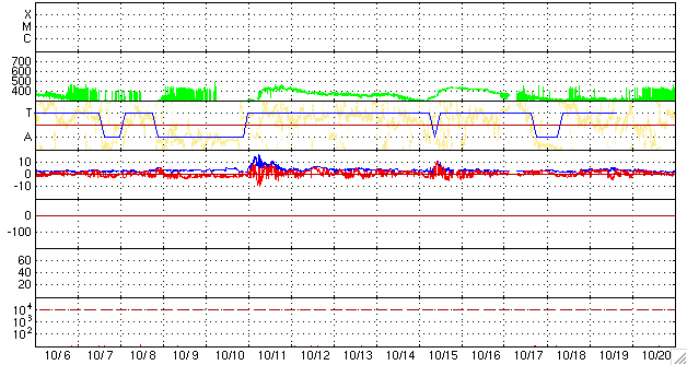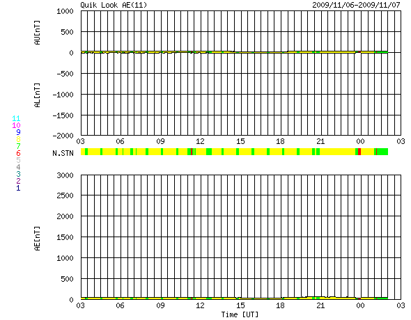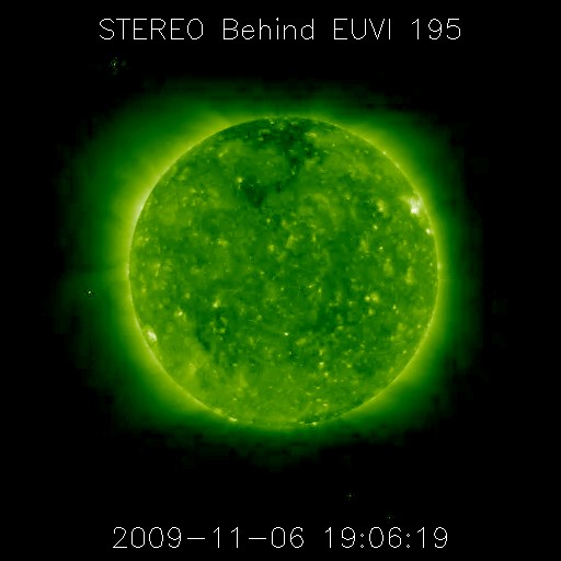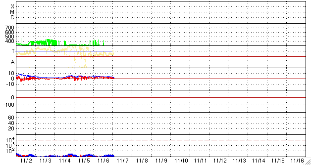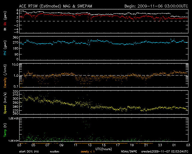 2009/11/ 7 11:53 更新 太陽風は非常に低速で、落ち着いています。磁気圏も静穏です。 担当 篠原 太陽風の速度は、280km/秒を下回るほどに下がっています。 かなり遅い速度です。 一方、磁場強度は、4nTあたりと平均的な強さを保っていましたが、 最新のところで急に2nTに下がっています。 太陽風磁場の南北成分は、ずっと北を向いています。 風速が低くて、地球への影響が及びにくいところに、 スイッチとも言える磁場が北向きとオフ状態ですので、磁気圏は非常に静穏です。 オーロラの活動度を示すAE指数のグラフは、完全に平坦になっています。 静かな状態はずっと続いていて、 シベリアの磁場のグラフも、3日間にわたって一直線となっています。 予想していたコロナホールの影響は、まだ現れていません。 前周期では、そろそろ磁場強度の強まりなどが始まっていたのですが、 現在はその様子も見られません。 タイミングが遅れている可能性もあるので、もうしばらく待ってみましょう。 SOHOの写真が停止しているので、今日はSTEREO Behindのコロナ写真を掲載します。 地球よりも4日半先の太陽です。 すると、北極付近からコロナホールが細長く中緯度側に伸びているのが見えます。 次の注目点はこの領域からの影響でしょうか。 まだ8日ほど先のことです。 太陽では、1030黒点群が太陽の中心付近にあるそうです。 しかし、X線のグラフは全く変動しておらず、活動度の低い黒点群の様です。 STEREO behind衛星による太陽コロナ写真。地球よりも、4日半ほど先の太陽です。 (c) NASA ![]() ACEが観測した太陽風の磁場(1番上の枠、白線は全体の強度、赤線は南北成分) および、太陽風の密度(3番目の橙線)、速度(4番目の黄線) (c) NOAA/SWPC ![]() リアルタイムAE指数 下段のAEグラフの値が高くなると、オーロラ活動が活発化しています。 (c) 京都大学, NICT ![]() シベリアで観測された3日間の磁場データ 右側の3分の1が、昨日のデータになります。グラフが上がったり下がったりすると、オーロラ活動が活発化しています。 (c) NICT ![]() 27日の太陽周期に合わせたデータプロット 太陽が同じ面を地球に向けていた27日前の変化から、今後を予想することができます。 (c) NICT