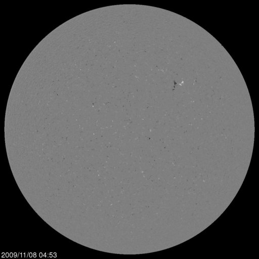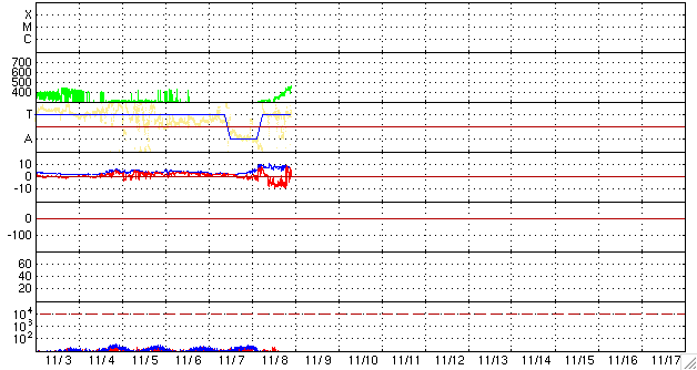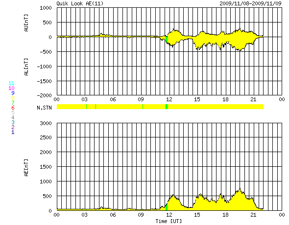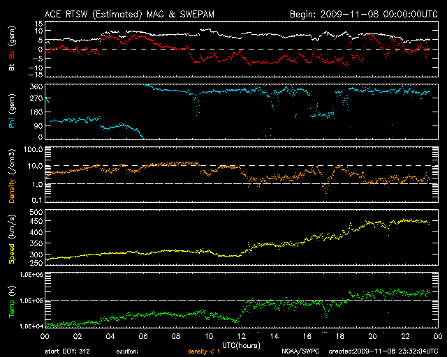 2009/11/ 9 08:32 更新 太陽風の速度が450km/秒へ上昇しています。南向き磁場の強まりで、オーロラ活動が活発になりました。 担当 篠原 1日ほど遅れたタイミングで、太陽風に変化がやってきました。 昨日のニュース以降、太陽風の磁場強度が10nT近くまで強まりました。 夜になると(8日21時、世界時8日12時)速度の上昇も始まり、 それまでの300km/秒から、現在、450km/秒まで高まっています。 やや高速の太陽風になりました。 この間、磁場の南北成分が南寄りに偏るようになり、 -5nTから-10nT近い強さで変化しました。 そのため、オーロラ活動が強められ、 AE指数で500〜700nTの中規模のオーロラ活動が連続的に発生しました。 オーロラの輝きは、激しいものではありませんでしたが、 ライブカメラ(Live!オーロラ)でも楽しむことができました。 現在の太陽風は、速度は上がったものの、磁場強度は5nT程度に下がっています。 速度の上昇もこのくらいまででしょうか。 磁場の強い南向きも終わり、オーロラ活動は一段落となりそうです。 今後は、磁場が南を向くと小規模のオーロラが発生する、という様な感じではないでしょうか。 速度の高まりがどのくらい続くのかも、ちょっと読みにくいところです。 前周期の変化では、400km/秒前後の状態が6日ほど続きました。 今回はどうなるでしょうか。 太陽は、無黒点でたいへん穏やかです。 SOHOの太陽観測は、回復しつつあるようです。 可視光写真がやや古いので、磁場写真を掲載します。 1030黒点群があったと思われる磁場の強まりが、中心から右上のあたりに残っています。 SOHO EIT195による太陽コロナ。9日4時(世界時8日19時)。 (c) SOHO (ESA & NASA) ![]() SOHOによる太陽面の磁場分布。中央右上寄りに、1030黒点群の名残りがあります。 (c) SOHO (ESA & NASA) ![]() ACEが観測した太陽風の磁場(1番上の枠、白線は全体の強度、赤線は南北成分) および、太陽風の密度(3番目の橙線)、速度(4番目の黄線) (c) NOAA/SWPC ![]() リアルタイムAE指数 下段のAEグラフの値が高くなると、オーロラ活動が活発化しています。 (c) 京都大学, NICT ![]() シベリアで観測された3日間の磁場データ 右側の3分の1が、昨日のデータになります。グラフが上がったり下がったりすると、オーロラ活動が活発化しています。 (c) NICT ![]() 27日の太陽周期に合わせたデータプロット 太陽が同じ面を地球に向けていた27日前の変化から、今後を予想することができます。 (c) NICT