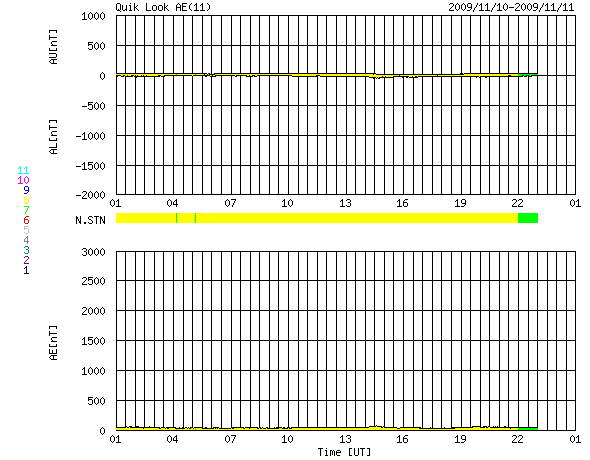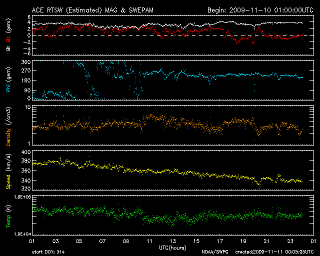 2009/11/11 09:05 更新 太陽風は低速風になり、磁気圏もたいへん静かです。1030黒点群が見ています。 担当 篠原 太陽風の速度は、380km/秒から340km/秒へと低下し、 すっかり低速風に変わりました。 もうしばらく様子を見る必要がありますが、前周期ほどには速度を保てないようです。 磁場強度は3〜4nTとやや弱め。 南北成分は北寄りになり、地球の磁気圏への影響は一段と小さくなっています。 このため、今日のAE指数のグラフは完全に平坦になっていて、 オーロラ活動はたいへん弱かったようです。 SOHO EIT195を見ると、7日のニュースでSTEREO衛星を使って紹介した、 北極から垂れ下がったコロナホールが見えてきました。 だいたい4日後ということで、予定通りの出現です。 かなり北に寄っているので、地球への影響がどの程度あるのか分かりませんが、 もう4日後の、15日くらいに注目してください。 ただし、太陽風に影響が現れても、あまり大きな変動にはならないと思います。 今日のSOHOの可視光写真に、昨日再出現した1030黒点群が写っています。 西の端の近くです。 規模は小さく、X線を見てもフレア活動は全くありません。 太陽は静穏です。 SOHO EIT195による太陽コロナ。11日8時半(世界時10日23時半)。 (c) SOHO (ESA & NASA) ![]() SOHOによる太陽可視光写真。1030黒点群が西の端にあります。 (c) SOHO (ESA & NASA) ![]() ACEが観測した太陽風の磁場(1番上の枠、白線は全体の強度、赤線は南北成分) および、太陽風の密度(3番目の橙線)、速度(4番目の黄線) (c) NOAA/SWPC ![]() リアルタイムAE指数 下段のAEグラフの値が高くなると、オーロラ活動が活発化しています。 (c) 京都大学, NICT ![]() シベリアで観測された3日間の磁場データ 右側の3分の1が、昨日のデータになります。グラフが上がったり下がったりすると、オーロラ活動が活発化しています。 (c) NICT ![]() 27日の太陽周期に合わせたデータプロット 太陽が同じ面を地球に向けていた27日前の変化から、今後を予想することができます。 (c) NICT