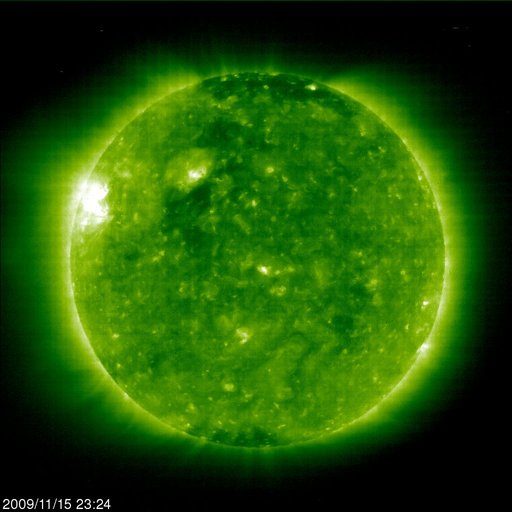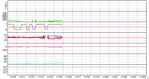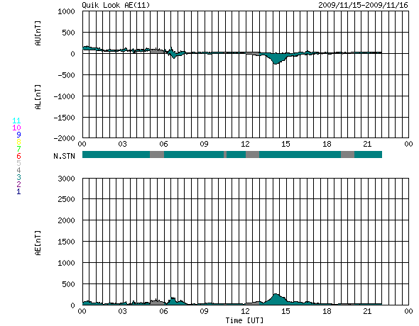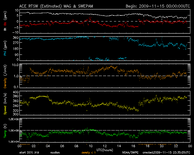 2009/11/16 08:36 更新 南向き磁場は更に半日ほど続き、オーロラもある程度活動的だった様です。昨日の黒点に1031群と番号がつきました。 担当 篠原 太陽風磁場の南寄りの傾向は、振幅は小さくなったりしたものの、 昨日のニュース以降も夜まで続き、 -5nTから-1nTくらいの間をゆっくりと変動していました。 速度は、360km/秒の低速状態が続いています。 この影響で、磁気圏のオーロラ活動もある程度活発な状態が続きました。 AE指数では、200〜300nTの小さな変化が記録されていますが、 色が深緑色となっていて、観測点の数がそろっていません。 本当はもう少し大きな変化だったのではないでしょうか。 シベリア磁場データでは、昨日よりも大きめの変動が記録されていますし、 沖縄の磁場データも、昨日より大きな変化をしています。 今日未明くらいに太陽風の様子が変化したようで、 磁場の南寄りの傾向は終わったようです。 この後は、磁気圏も静かになってしまうでしょう。 太陽では、昨日小さく見えていた黒点群の黒点が増えています。 NOAAの黒点番号も、1031群と付けられています。 一方、EIT195で東端に明るく見えていた活動領域には 白斑があるだけで、黒点はなかったようです。 GOESのX線データは、小さく変化しているだけで、 目立ったフレアの活動は見られません。 見えている小さな変動は、 東端の明るい領域ではなく、1031黒点群の変化なのかもしれません。 SOHO EIT195による太陽コロナ。16日7時半(世界時15日22時半)。 (c) SOHO (ESA & NASA) ![]() SOHOによる太陽可視光写真。太陽の中心から北東(左上)寄りに1031黒点群が見えます。 (c) SOHO (ESA & NASA) ![]() ACEが観測した太陽風の磁場(1番上の枠、白線は全体の強度、赤線は南北成分) および、太陽風の密度(3番目の橙線)、速度(4番目の黄線) (c) NOAA/SWPC ![]() リアルタイムAE指数 下段のAEグラフの値が高くなると、オーロラ活動が活発化しています。 (c) 京都大学, NICT ![]() シベリアで観測された3日間の磁場データ 右側の3分の1が、昨日のデータになります。グラフが上がったり下がったりすると、オーロラ活動が活発化しています。 (c) NICT ![]() 沖縄の磁場擾乱 下へ下がるほど、擾乱が発達している事を意味します。 (c) NICT ![]() 27日の太陽周期に合わせたデータプロット 太陽が同じ面を地球に向けていた27日前の変化から、今後を予想することができます。 (c) NICT