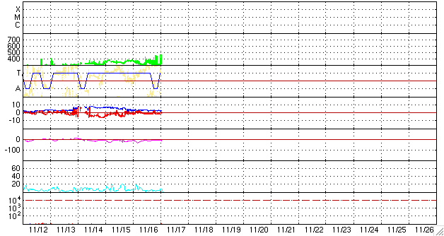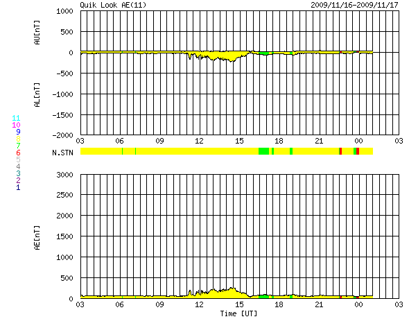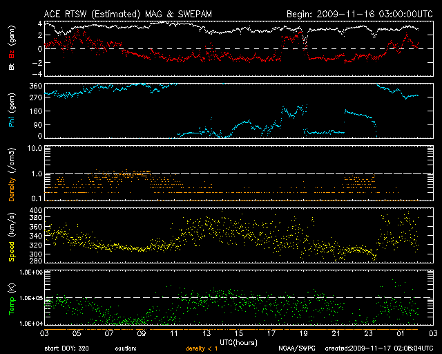 2009/11/17 11:09 更新 速度300km/秒の遅い太陽風になっています。磁気圏も静穏です。 担当 篠原 太陽風の速度は、360km/秒から300km/秒へ再び下がり、遅い風にもどっています。 密度も減少していて、速度データが散乱を始めています。 磁場強度も、3nTと弱まった状態です。 静かな太陽風が流れています。 磁気圏も概ね静穏です。 磁場の南北成分が-1nTと弱い南向きになっているため、 AE指数で200nTくらいの小さな変動が観測されています。 太陽風の磁場強度は弱いので、大きく南を向くことはありませんし、 速度も低速なことから、オーロラ活動がこれ以上活発になることはなさそうです。 この後も、太陽風、磁気圏ともに静穏な状態が続きそうです。 次の擾乱要因としては、 SOHO EIT195の太陽の中心付近北寄りに見えているコロナホールでしょう。 規模は小さいですが、緯度は低いので、ある程度の影響がやってくるのではないでしょうか。 到来は、3〜4日後だと思います。 太陽では、1031黒点群が小さく見えています。 規模に特に変化はなく、特に活発化する様子も見えません。 GOESのX線のデータは小さく変化していますが、太陽も穏やかな状態が続きそうです。 SOHO EIT195による太陽コロナ。17日1時半(世界時16日16時半)。 (c) SOHO (ESA & NASA) ![]() SOHOによる太陽可視光写真。太陽の中心から北(上)寄りに1031黒点群が見えます。 (c) SOHO (ESA & NASA) ![]() ACEが観測した太陽風の磁場(1番上の枠、白線は全体の強度、赤線は南北成分) および、太陽風の密度(3番目の橙線)、速度(4番目の黄線) (c) NOAA/SWPC ![]() リアルタイムAE指数 下段のAEグラフの値が高くなると、オーロラ活動が活発化しています。 (c) 京都大学, NICT ![]() シベリアで観測された3日間の磁場データ 右側の3分の1が、昨日のデータになります。グラフが上がったり下がったりすると、オーロラ活動が活発化しています。 (c) NICT ![]() 27日の太陽周期に合わせたデータプロット 太陽が同じ面を地球に向けていた27日前の変化から、今後を予想することができます。 (c) NICT