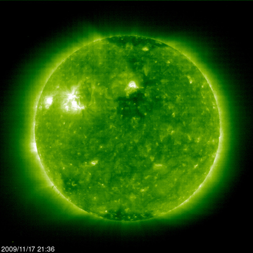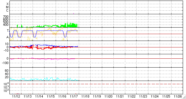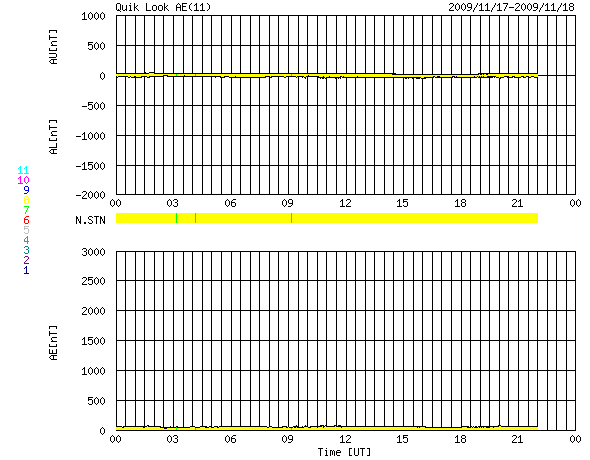 2009/11/18 08:39 更新 太陽に活動的な領域がいくつも見えています。太陽風は低速で、磁気圏はとても静かです。 担当 篠原 最新の太陽可視光写真では、1031黒点群は見えなくなっています。 太陽は無黒点になっているようです。 一方、SOHO EIT195を見ると、太陽の東端に明るい活動領域がもうひとつ出現しました。 数日前から見えていた広い活動領域の左側の小さな領域です。 STEREO Behindを参照すると、この1日の間に出現した様です。 可視光写真では白斑があるだけですが、今後更に強まって黒点が出現するかもしれません。 注目してみてください。 EIT195では、東端の向こう側にももうひとつ明るい領域が見えています。 今日の太陽コロナ写真は明るい部分があちこちにあって、だいぶにぎやかです。 太陽風は、速度300〜320km/秒と遅い風が続いています。 下がっていたプラズマ密度は、ある程度回復し、速度データのばらつきも減っています。 磁場強度は、3nTと弱いままです。 磁気圏もたいへん静かで、AE指数は全く変化していません。 穏やかな状態は、もう2〜3日ほど続くと予想しています。 SOHO EIT195では、北極から伸びるコロナホールが、太陽の中心線を過ぎて西側に回りました。 このコロナホールは、前周期よりもより低緯度側に広がっているので、 地球へ影響が及びやすくなっていると思います。 どの程度の変化がやって来るのか、注目してください。 SOHO EIT195による太陽コロナ。18日6時半(世界時17日21時半)。 (c) SOHO (ESA & NASA) ![]() SOHOによる太陽可視光写真。1031黒点群は見えなくなったようです。 (c) SOHO (ESA & NASA) ![]() GOES衛星の太陽X線データ (c) NOAA/SWPC ![]() ACEが観測した太陽風の磁場(1番上の枠、白線は全体の強度、赤線は南北成分) および、太陽風の密度(3番目の橙線)、速度(4番目の黄線) (c) NOAA/SWPC ![]() リアルタイムAE指数 下段のAEグラフの値が高くなると、オーロラ活動が活発化しています。 (c) 京都大学, NICT ![]() シベリアで観測された3日間の磁場データ 右側の3分の1が、昨日のデータになります。グラフが上がったり下がったりすると、オーロラ活動が活発化しています。 (c) NICT ![]() 27日の太陽周期に合わせたデータプロット 太陽が同じ面を地球に向けていた27日前の変化から、今後を予想することができます。 (c) NICT