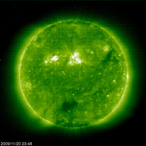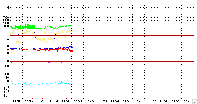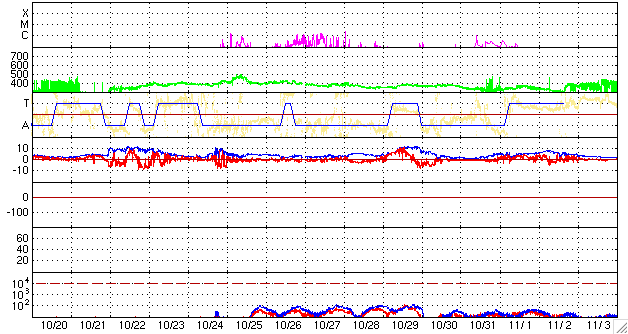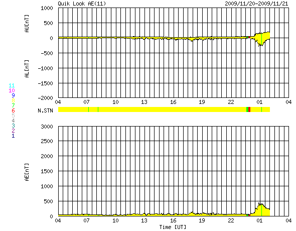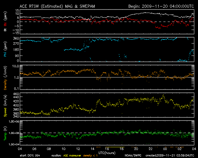 2009/11/21 12:59 更新 太陽風の速度は、400km/秒台前半に上昇しました。磁気圏は比較的静穏です。 担当 篠原 昨夜から、太陽風の速度は400km/秒台に上がり、 コロナホールの影響と思われる緩やかな高まりを迎えています。 磁場強度も、速度上昇とともに、一時的に10nTにまで強まりました。 現在は、既に5nTへ下がっています。 このため、速度の上昇もこの辺りが最高速度の可能性があります。 最も高まったところで430km/秒と、今回も高速風と呼べる規模の変化ではありませんでした。 磁気圏でもそれほどの活動は発生していません。 AE指数では、最後のところに400nTの小規模変動が1つ観測されている程度です。 太陽風の変化は、今周期も前周期と同程度の規模に留まる様です。 SOHO EIT195を見ると、今度は南半球側にコロナホールが見えています。 前周期と同じ様な姿をしています。 この領域は、前周期の太陽風には目立った影響はありませんでした。 今回も同様ではないかと予想されますが、3-4日後くらいに注目して下さい。 太陽では、西側(右側)の1032黒点群はほとんど分からなくなっています。 X線のデータには目立った変化はなく、フレア活動は静穏です。 SOHO EIT195による太陽コロナ。21日9時(世界時21日0時)。 (c) SOHO (ESA & NASA) ![]() SOHOによる太陽可視光写真。1032黒点群だけが見えているようです。 (c) SOHO (ESA & NASA) ![]() ACEが観測した太陽風の磁場(1番上の枠、白線は全体の強度、赤線は南北成分) および、太陽風の密度(3番目の橙線)、速度(4番目の黄線) (c) NOAA/SWPC ![]() リアルタイムAE指数 下段のAEグラフの値が高くなると、オーロラ活動が活発化しています。 (c) 京都大学, NICT ![]() シベリアで観測された3日間の磁場データ 右側の3分の1が、昨日のデータになります。グラフが上がったり下がったりすると、オーロラ活動が活発化しています。 (c) NICT ![]() 27日の太陽周期に合わせたデータプロット 太陽が同じ面を地球に向けていた27日前の変化から、今後を予想することができます。 (c) NICT