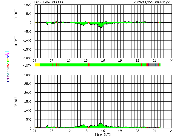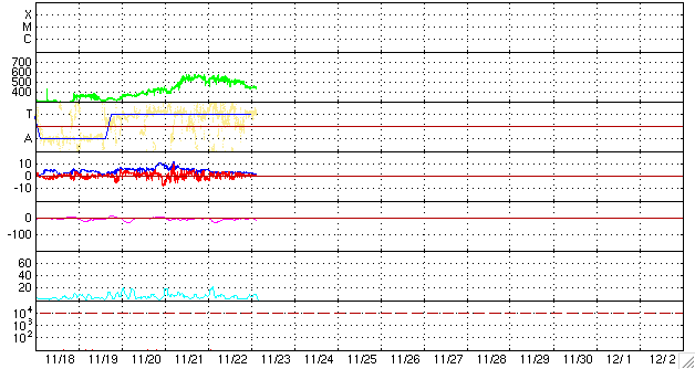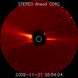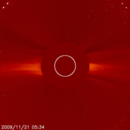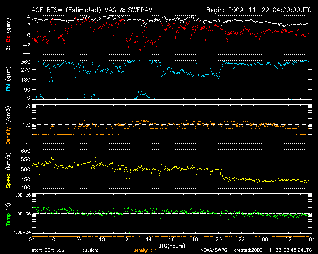 2009/11/23 12:48 更新 太陽風の速度が450km/秒へ下がっています。磁気圏は概ね静穏です。 担当 篠原 太陽風の速度は、今朝まで500km/秒台前半を保っていましたが、 23日5時(世界時22日20時)頃に450km/秒へ急に下がり、その状態が続いています。 高速風は、やや高速というレベルに下がっています。 磁場強度も、昨日の時点で3nTに下がっていましたが、 現在は更に弱まって、2nTとなっています。 太陽風の影響はだいぶ弱まっています。 磁気圏も概ね静穏です。 オーロラの活動度を示すAE指数は、200-300nTの小さい活動が見られる程度です。 太陽風速度の高まりも終わり、一旦静穏になるようです。 一方、次のコロナホールの影響が近づいています。 SOHO EIT195では、南半球のコロナホールが更に西側へ回り、 明日くらいにも太陽風の変化がやってくるかもしれません。 やや緯度が高めなので、どの程度の変化がやって来るのか、注目してください。 太陽では、1033黒点群だけが残って見えています。 X線の変化も全くなくなり、穏やかです。 一方、EIT195の写真では、ふたつの活動領域に 明るいコロナガスのループが見えていて、なかなかきれいです。 一昨日の現象ですが、21日午後にCME(太陽ガスの放出現象)が発生しました。 発生したのは、太陽の南東(左下)の領域です。 SOHO LASCO C2と、STEREO Ahead COR2の動画をそれぞれ掲載します。 STEREOは、60度横から太陽を眺めています。 2枚の写真を見比べて、宇宙空間でのガスの広がりをイメージしてみてください。 地球から見ると、斜め方向の噴出だと思われます。 影響がやって来るのかどうか、微妙な感じです。 到来は、背景の太陽風の速度にも関係しますが、25日前後でしょうか。 磁場のかたまりが飛んできて、まとまった南向きを作り、 オーロラを活発化させることもあるので、気をつけて見ていてください。 SOHO EIT195による太陽コロナ。23日9時(世界時23日0時)。 (c) SOHO (ESA & NASA) ![]() SOHOによる太陽可視光写真。1033黒点群が見えています。 (c) SOHO (ESA & NASA) ![]() SOHO LASCO C2カメラによる、CMEの様子。やや斜め方向に太陽ガスが飛び出していると思われます。 (c) SOHO (ESA & NASA) ![]() STEREO Ahead衛星によるCMEの様子。60度ほど違う角度から太陽を見ています。 (c) NASA ![]() ACEが観測した太陽風の磁場(1番上の枠、白線は全体の強度、赤線は南北成分) および、太陽風の密度(3番目の橙線)、速度(4番目の黄線) (c) NOAA/SWPC ![]() リアルタイムAE指数 下段のAEグラフの値が高くなると、オーロラ活動が活発化しています。 (c) 京都大学, NICT ![]() シベリアで観測された3日間の磁場データ 右側の3分の1が、昨日のデータになります。グラフが上がったり下がったりすると、オーロラ活動が活発化しています。 (c) NICT ![]() 27日の太陽周期に合わせたデータプロット 太陽が同じ面を地球に向けていた27日前の変化から、今後を予想することができます。 (c) NICT