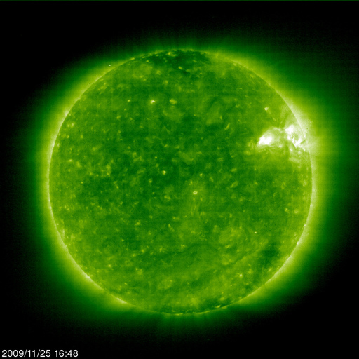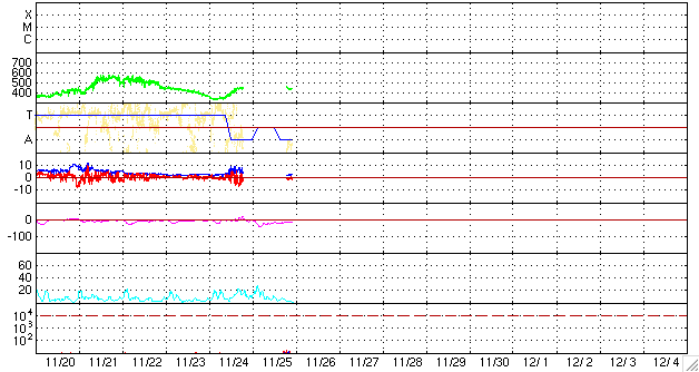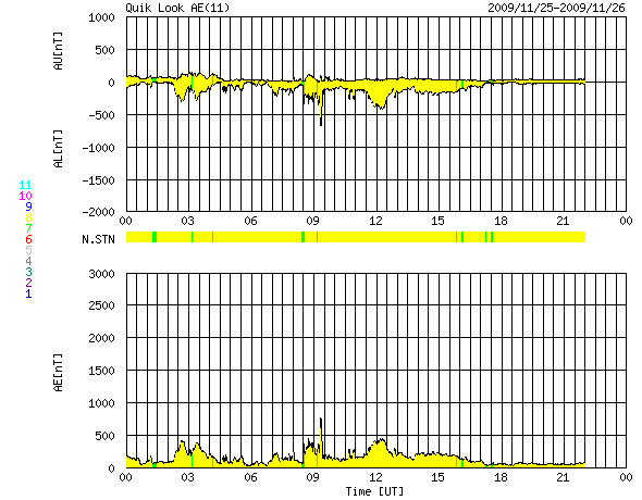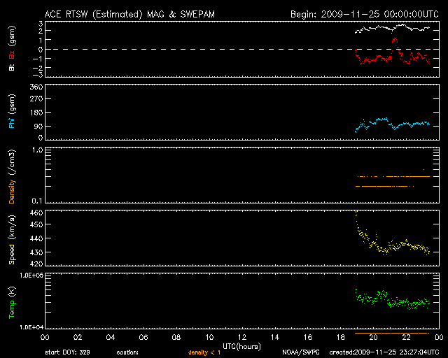 2009/11/26 08:27 更新 やや高速の太陽風によって、小規模のオーロラ活動が続きました。高速風は終わりつつあります。 担当 篠原 昨日一日、太陽風は450km/秒程度のやや高速の風が続きました。 ACE衛星のデータはほぼ1日停止していましたが、SOHOの観測で確認できます。 その影響で、磁気圏では小規模のオーロラ活動が連続的に発生しました。 アラスカのライブカメラを見ていると、激しい変化ではないものの、 オーロラの光がずっと光り続けている様子を見ることができました。 最近は穏やかな日が多いので、この程度でも活動が続くと見ていて楽しいものです。 今朝の太陽風は、速度は430km/秒、磁場強度は3nTと、どちらも弱まりつつあり、 コロナホールの影響は終わりつつあるようです。 すると、これから再び低速の穏やかな太陽風が続くと思われます。 SOHO EIT195の太陽コロナは、西端の活動領域を除くと、 全体的にのっぺりとしていて、高速風の原因となるコロナホールなどはありません。 当分、静かな日が続きそうです。 2つの黒点群が消えた後、太陽は無黒点が続いています。 今日も静穏です。 STEREO Behindで先回りをしても、太陽には活動的な領域は見られず、 こちらも当分静かな状態が続きそうです。 SOHO EIT195による太陽コロナ。26日2時(世界時25日17時)。 (c) SOHO (ESA & NASA) ![]() ACEが観測した太陽風の磁場(1番上の枠、白線は全体の強度、赤線は南北成分) および、太陽風の密度(3番目の橙線)、速度(4番目の黄線) (c) NOAA/SWPC ![]() リアルタイムAE指数 下段のAEグラフの値が高くなると、オーロラ活動が活発化しています。 (c) 京都大学, NICT ![]() シベリアで観測された3日間の磁場データ 右側の3分の1が、昨日のデータになります。グラフが上がったり下がったりすると、オーロラ活動が活発化しています。 (c) NICT ![]() 27日の太陽周期に合わせたデータプロット 太陽が同じ面を地球に向けていた27日前の変化から、今後を予想することができます。 (c) NICT