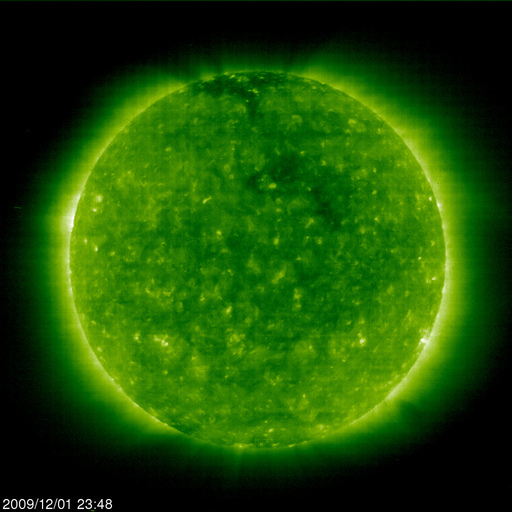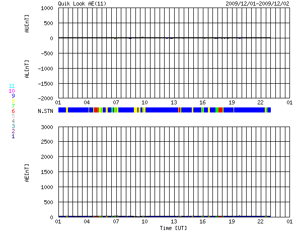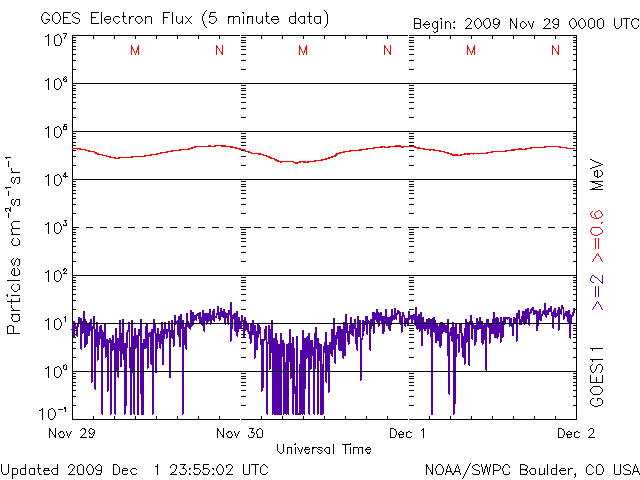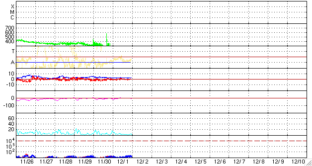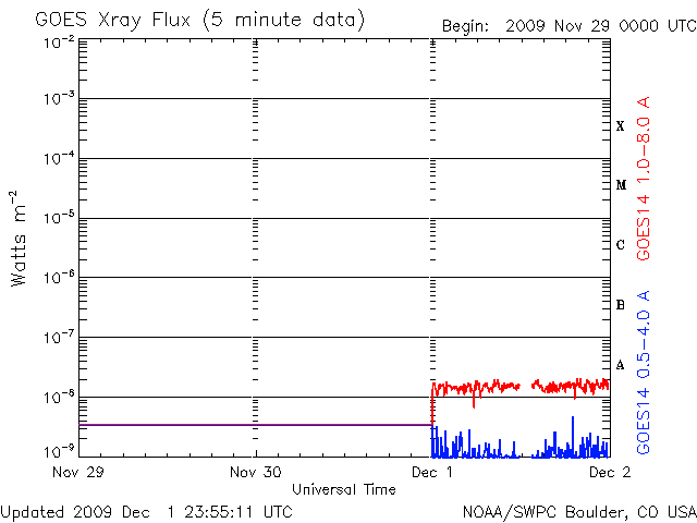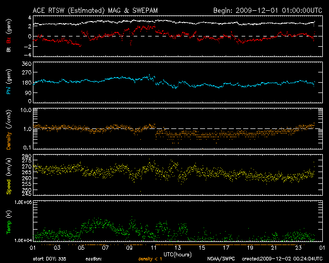 2009/12/ 2 09:24 更新 太陽風はとても遅い状態が続いています。磁気圏も静穏です。太陽は無黒点です。 担当 篠原 11月いっぱいでGOES10衛星が引退し、 昨日より、X線のグラフには新しくGOES14のデータが使われる様になりました。 観測装置が変わったため、グラフの様子にも多少変化があるとのことです(上記ページ参照)。 今日のように、X線の強度がたいへん弱い時、 GOES10では、グラフが完全に下がりきって一直線になっていたものが(昨日の図を参照)、 GOES14では、下がりきらずに小さく変動するように見えるとのことです(今日の図を参照)。 活動領域が上がってきて、X線のレベルが上昇すると、 ノイズレベルの差が相対的に小さくなるため、 これまでのGOES10とほとんど同じグラフになるとのことです。 小さな活動が続く現状では、しばらく見続けて、 新しい衛星のデータの変化の様子に慣れていく必要があるのかもしれません。 今日のX線データはたいへん静かのようです。 また、GOES10の引退に伴い、高エネルギー電子のグラフがGOES11だけになっています。 これまで、場所の違う2衛星があることで、 増加の様子などがより詳しく見えていたのですが、 1つの衛星になって、擾乱の様子が少し見にくくなりそうです。 高エネルギー電子は、このところたいへん低いレベルが続いていて、 全く話題にならなくなっていますが、 再び活動が強まってきた時に、衛星の数が減ってしまったことを実感するのかもしれません。 (これは現状に対するコメントで、GOESの長期的な観測計画に対するものではありません) 太陽風は、今日も非常に遅い状態が続いています。 速度は昨日からほとんど変わらず、260〜270km/秒に留まっています。 最大限速度が下がりきっていると言えそうなレベルです。 磁場強度も弱く、2〜3nTで安定しています。 磁気圏も非常に静穏です。 AE指数は全く変化が見られません。 明日、明後日くらいまではこのまま静かな状態が続きそうです。 その後、コロナホールの影響がやって来るかもしれません。 前周期は450km/秒にやっと届いた程度の風しか来ておらず、 今周期も同程度ではないかと思います。 その後はまたしばらく静かな状態が続きます。 SOHO EIT195では、太陽の東側(左側)には、コロナホールなどは見られません。 太陽は静穏です。 昨日見えた黒点は、短時間の発生だったようで、 NOAAの黒点番号には数えられていませんでした。 SOHO EIT195による太陽コロナ。2日9時(世界時2日0時)。 (c) SOHO (ESA & NASA) ![]() SOHOによる太陽可視光写真。無黒点に戻りました。 (c) SOHO (ESA & NASA) ![]() GOES衛星の太陽X線データ (c) NOAA/SWPC ![]() GOES衛星による、静止衛星軌道における高エネルギー電子の変化 (c) NOAA/SWPC ![]() ACEが観測した太陽風の磁場(1番上の枠、白線は全体の強度、赤線は南北成分) および、太陽風の密度(3番目の橙線)、速度(4番目の黄線) (c) NOAA/SWPC ![]() リアルタイムAE指数 下段のAEグラフの値が高くなると、オーロラ活動が活発化しています。 (c) 京都大学, NICT ![]() シベリアで観測された3日間の磁場データ 右側の3分の1が、昨日のデータになります。グラフが上がったり下がったりすると、オーロラ活動が活発化しています。 (c) NICT ![]() 27日の太陽周期に合わせたデータプロット 太陽が同じ面を地球に向けていた27日前の変化から、今後を予想することができます。 (c) NICT
