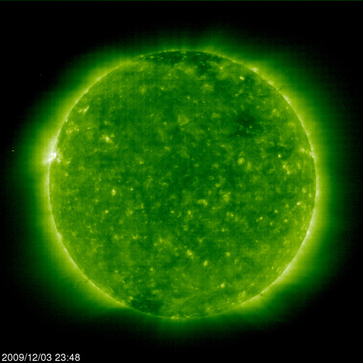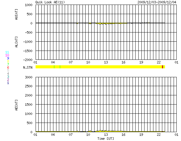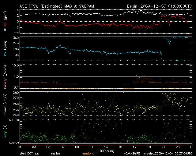 2009/12/ 4 09:27 更新 250km/秒のかなり遅い太陽風が続いています。磁気圏も静穏です。 担当 篠原 昨日の記事で11月の無黒点日数についてまとめました。 昨日は更新時刻が遅くなりましたので、どうぞご覧ください。 とても弱い太陽風が続いています。 速度は、昨日より250km/秒が続いています。 今朝になって260km/秒へ上がっているようですが、 変化の幅として考えるとほんのわずかのことです。 プラズマの密度も下がったままで、希薄で遅い風が続いています。 磁場強度も、3nT付近と弱めの状態が続いています。 南北成分は、ずっと南寄りが続いていますが、振幅は-1nTと小さく、 速度も遅いこともあり、磁気圏は静穏です。 オーロラの活動度を示すAE指数では、ごく小さな変化が見られる程度です。 ただし、現在のように穏やかな状況では、オーロラの見られる緯度が高緯度側に移動し、 AE指数では変化を正確に捉えられなくなっている可能性があります。 それでも、活動が弱いことに大きな違いはありません。 27日周期の図を参考にすると、今日いっぱいは低速の太陽風が続きそうです。 明日くらいに、コロナホールの影響による速度の高まりが見られるかもしれません。 こちらも、規模は小さなものとなるでしょう。 その後は、再び低速の太陽風が続きそうです。 SOHO EIT195では、太陽コロナの東側(左側)はのっぺりとしていて、 しばらく、変動は起こりそうにありません。 太陽は無黒点です。 EIT195の東端に小さな明るい領域が見えます。 STEREOを見ると、小さな活動を起こしたりしているようです。 SOHO EIT195による太陽コロナ。4日9時(世界時4日0時)。 (c) SOHO (ESA & NASA) ![]() SOHOによる太陽可視光写真。無黒点です。 (c) SOHO (ESA & NASA) ![]() ACEが観測した太陽風の磁場(1番上の枠、白線は全体の強度、赤線は南北成分) および、太陽風の密度(3番目の橙線)、速度(4番目の黄線) (c) NOAA/SWPC ![]() リアルタイムAE指数 下段のAEグラフの値が高くなると、オーロラ活動が活発化しています。 (c) 京都大学, NICT ![]() シベリアで観測された3日間の磁場データ 右側の3分の1が、昨日のデータになります。グラフが上がったり下がったりすると、オーロラ活動が活発化しています。 (c) NICT ![]() 27日の太陽周期に合わせたデータプロット 太陽が同じ面を地球に向けていた27日前の変化から、今後を予想することができます。 (c) NICT