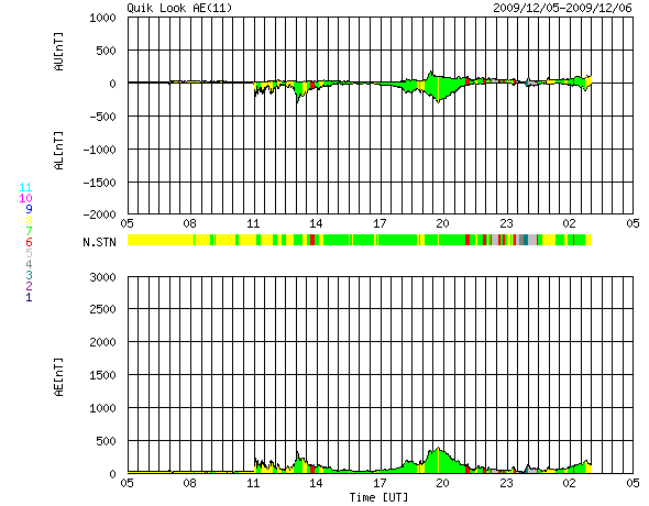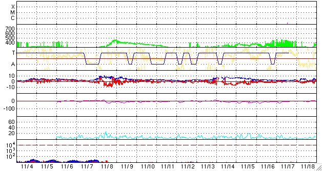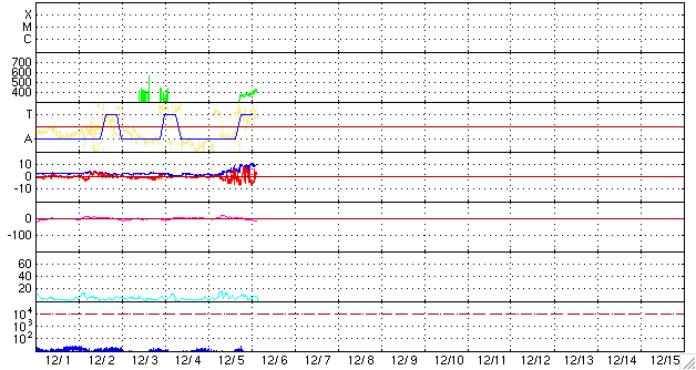 ACEが観測した太陽風の磁場(1番上の枠、白線は全体の強度、赤線は南北成分) および、太陽風の密度(3番目の橙線)、速度(4番目の黄線) (c) NOAA/SWPC ![]() リアルタイムAE指数 下段のAEグラフの値が高くなると、オーロラ活動が活発化しています。 (c) 京都大学, NICT ![]() シベリアで観測された3日間の磁場データ 右側の3分の1が、昨日のデータになります。グラフが上がったり下がったりすると、オーロラ活動が活発化しています。 (c) NICT ![]() 27日の太陽周期に合わせたデータプロット 太陽が同じ面を地球に向けていた27日前の変化から、今後を予想することができます。 (c) NICT