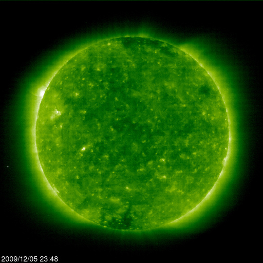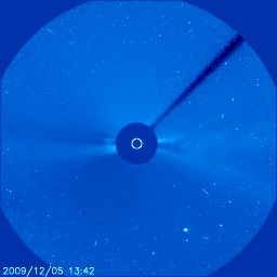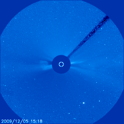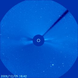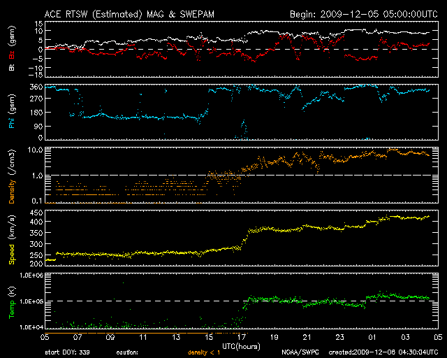 2009/12/ 6 13:30 更新 コロナホールの影響で、太陽風速度が400km/秒台に上昇しています。小規模のオーロラ活動も起きています。 担当 篠原 昨夜より、太陽風の速度、磁場強度、密度それぞれが高まり、 コロナホールの影響が到来したと考えられます。 昨日の午後より、磁場強度が強まり始め、5nTを超え、夜には10nTに上がりました。 現在も強さをほぼ保っています。 続いて、プラズマ密度が1個/cm^3を超えて、10個/cm^3に近づき、 速度も、350km/秒へ急に上がって、その後、現在までに420km/秒へ達しています。 27日周期の図によると、到来のタイミングは前周期とだいたい同じです。 速度や磁場強度の強まり具合も、今のところはよく似ています。 このまま前周期通りに進むのなら、 太陽風の速度は今日いっぱいで下がり始めることになるでしょう。 コロナホールの規模を考えると、こうなりそうに思います。 しかし、磁場強度は高いレベルを保っているので、 速度の変化には、もうしばらく注目したいところです。 磁場強度の強まりにより、-5nT程度の南向き磁場がやってきています。 その影響で、AE指数300nTくらいの小規模のオーロラ変動が記録されています。 引き続き、同程度の活動が期待できるので、ライブカメラなどに注目してみましょう。 太陽は無黒点で静穏です。 GOESのX線グラフで、昨日、赤い線が急に増加しています。 どうやら、SOHO EIT195で東端の向こう側に見える明るい領域でフレアが発生したようです。 続いて、CME(太陽ガスの放出現象)が発生しています。 SOHO LASCO C3の連続写真を掲載します。 左側へ白いガスが小さく飛び出しています。 SOHO EIT195による太陽コロナ。6日9時(世界時6日0時)。 (c) SOHO (ESA & NASA) ![]() SOHO衛星のLASCO C3カメラの映像 (c) SOHO (ESA & NASA)