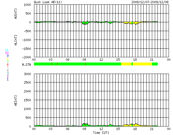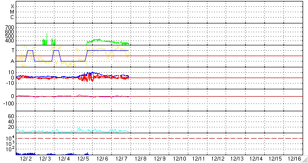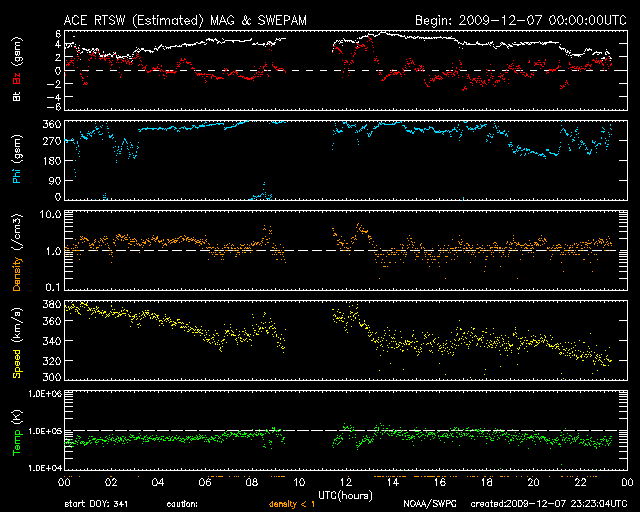2009/12/ 8 08:22 更新 300km/秒台前半の低速太陽風になっています。磁気圏も静穏です。 担当 篠原 太陽風の速度は、ゆっくりと下がり続けています。 昨日の360km/秒から、現在は、320km/秒まで遅くなっています。 すっかり低速風です。 磁場強度は、4nT付近を変化していて、やや弱めの傾向にあるようです。 南北成分も0nT付近に留まっていて、地球への影響は弱そうです。 オーロラ活動を示すAE指数では、100〜200nTくらいの小さな変化がいくつか見えます。 多少はオーロラが発生しているようです。 しかし、このような弱い変動が目立って見えるというのも、静穏な証拠と言えるかもしれません。 穏やかな太陽風は、当分続きます。 掲載している27日周期の図に見える前周期の太陽風は、ずっと低速です。 太陽面も、無黒点で静穏です。 SOHO EIT195では、東端(左端)に明るい点が見えますが、可視光では白斑があるだけの様です。 先月、久しぶりに黒点群の出現頻度が上がりましたが、 気がつくと、11月23日以来2週間にわたって無黒点の日が続いています。 太陽活動もそう簡単には高まらない様です。 SOHO EIT195による太陽コロナ。8日7時半(世界時7日22時半)。 (c) SOHO (ESA & NASA) ![]() SOHOによる太陽可視光写真。東の端に白斑が見えます。 (c) SOHO (ESA & NASA) ![]() ACEが観測した太陽風の磁場(1番上の枠、白線は全体の強度、赤線は南北成分) および、太陽風の密度(3番目の橙線)、速度(4番目の黄線) (c) NOAA/SWPC ![]() リアルタイムAE指数 下段のAEグラフの値が高くなると、オーロラ活動が活発化しています。 (c) 京都大学, NICT ![]() シベリアで観測された3日間の磁場データ 右側の3分の1が、昨日のデータになります。グラフが上がったり下がったりすると、オーロラ活動が活発化しています。 (c) NICT ![]() 27日の太陽周期に合わせたデータプロット 太陽が同じ面を地球に向けていた27日前の変化から、今後を予想することができます。 (c) NICT