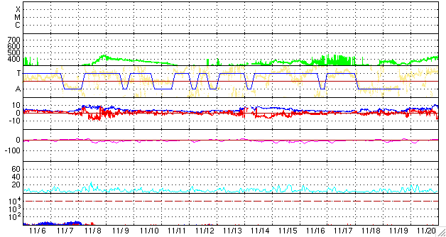 右側の3分の1が、昨日のデータになります。グラフが上がったり下がったりすると、オーロラ活動が活発化しています。