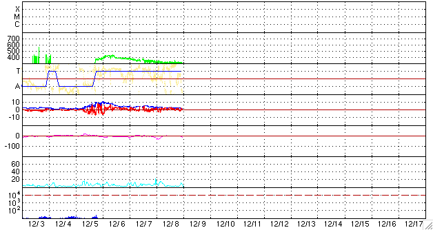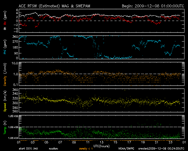 - 2009/12/ 5 12:06 太陽風の速度が230km/秒まで下がりました。非常に遅い速度です。