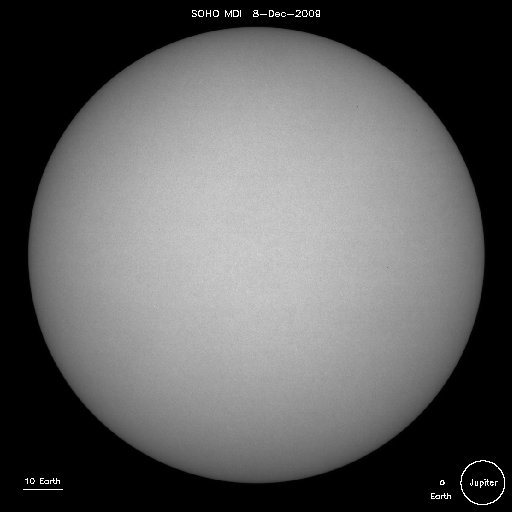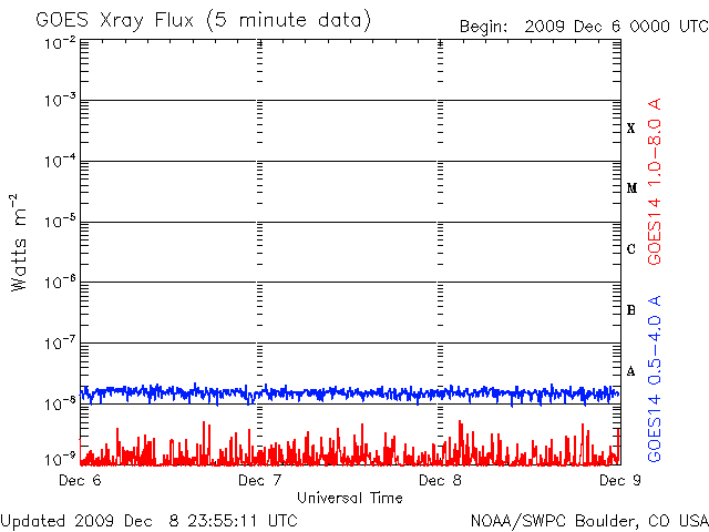 - 2009/12/ 7 12:39 太陽風速度は下がり、360km/秒の低速風になっています。太陽は無黒点が続いています。