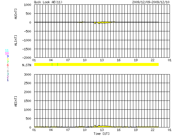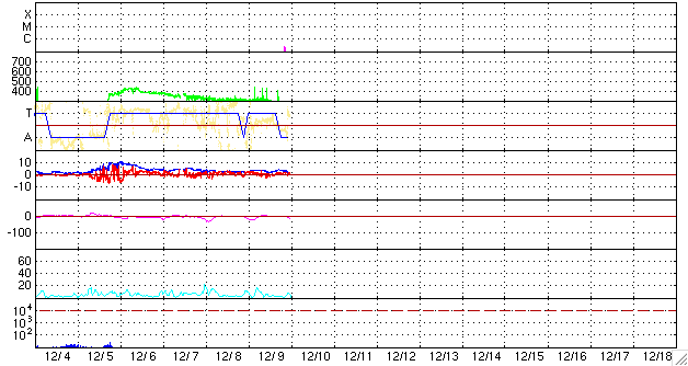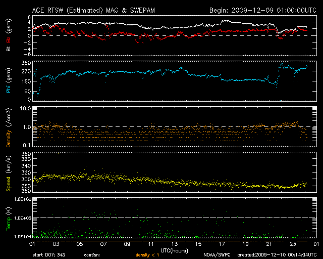 2009/12/10 09:15 更新 太陽風は280km/秒に下がっています。小さな黒点群が上がって来たようです。 担当 篠原 速度の遅い太陽風が続いています。 速度は、昨日からまた下がって、280km/秒となっています。 速度がここまで下がることは比較的珍しかったので、 「かなり遅い風」といつも表現していますが、 最近は、この速度まで下がるのも普通のことになってしまいました。 磁場強度も、3nT前後で弱めです。 太陽風が穏やかなため、磁気圏も静かで、 AE指数はほとんど変化していません。 遅い太陽風は、このまま続くでしょう。 もうしばらくすると、次の変動の原因となるコロナホールが、 太陽の東の端から見えて来ます。 太陽ではX線のデータが強まり、Bクラスの変化が発生しています。 発生源は、EIT195の東の端で明るく光っている領域です。 ここに小さな黒点があるようで、 例えば、ぐんま天文台の太陽望遠鏡写真で見ることができます。 (リアルタイムなので、晴れているうちにご覧下さい) SOHOは、更新が遅れていて、 まだ見ることができません。 どのような活動度の黒点でしょうか。 ![]() ACEが観測した太陽風の磁場(1番上の枠、白線は全体の強度、赤線は南北成分) および、太陽風の密度(3番目の橙線)、速度(4番目の黄線) (c) NOAA/SWPC ![]() リアルタイムAE指数 下段のAEグラフの値が高くなると、オーロラ活動が活発化しています。 (c) 京都大学, NICT ![]() シベリアで観測された3日間の磁場データ 右側の3分の1が、昨日のデータになります。グラフが上がったり下がったりすると、オーロラ活動が活発化しています。 (c) NICT ![]() 27日の太陽周期に合わせたデータプロット 太陽が同じ面を地球に向けていた27日前の変化から、今後を予想することができます。 (c) NICT