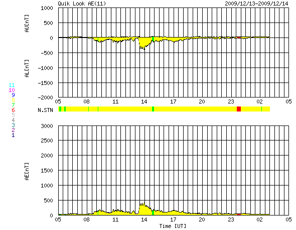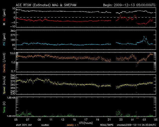 2009/12/14 13:33 更新 太陽風磁場が1日にわたって南向きになりました。低速風のため、小規模のオーロラ活動が発生しています。 担当 篠原 昨日より、太陽風が特徴的な変化をしています。 昨日のニュースの時点で、磁場強度が8nTほどに強まっていましたが、 その後、南北成分が南向きに偏るようになり、 最大で-5nTほどの南向きがほぼ1日にわたって続いています。 今朝、南北成分が0nT付近に戻り、南向きは終わったかと思われたのですが、 お昼前になって、再び-5nTに急に傾き、南向きの状態が3時間ほど続いています。 太陽からまとまった磁場のかたまりが流れてきたのだと思われます。 STEREOを見ると、7日や8日に小規模のCME(太陽ガスの放出現象)が 地球のある方向に飛び出しています。 あるいは、これらが関係しているのかもしれません。 磁場が南向きになったことで、磁気圏にエネルギーが流れ込みやすくなりました。 しかし、太陽風の速度は270km/秒前後とかなり遅かったため、 オーロラ活動の規模はかなり限定的で、 AE指数では、最大で300nTの変動がひとつと、 その前後に100〜200nTほどのたいへん小さい変化が続いている程度です。 それでも、昨夜のアラスカのライブカメラ(Live! オーロラ)では、 きれいなオーロラの輝きを見ることができました。 現在の状況を見ると、太陽風磁場の強まりは終わりに近づいているように思います。 速度はこのまま遅い状態が続きますが、磁場強度が下がり、 それとともに磁気圏も静穏に戻るでしょう。 次の変動は、18日頃が目安です。 太陽には、1034黒点群が残っています。 可視光写真では、小さな点々がくっきりと見えています。 また、そのもう少し上に、新しく発生した小さな黒点群が見えています。 GOESのX線強度は、急に上がり、Bクラスの変化も見えています。 1034群の活動なのかどうか、よく分かりません。 SOHO EIT195による太陽コロナ。14日10時半(世界時14日1時半)。 (c) SOHO (ESA & NASA) ![]() SOHOによる太陽可視光写真。1034黒点群は中心部に近づいています。 (c) SOHO (ESA & NASA) ![]() ACEが観測した太陽風の磁場(1番上の枠、白線は全体の強度、赤線は南北成分) および、太陽風の密度(3番目の橙線)、速度(4番目の黄線) (c) NOAA/SWPC ![]() リアルタイムAE指数 下段のAEグラフの値が高くなると、オーロラ活動が活発化しています。 (c) 京都大学, NICT ![]() シベリアで観測された3日間の磁場データ 右側の3分の1が、昨日のデータになります。グラフが上がったり下がったりすると、オーロラ活動が活発化しています。 (c) NICT ![]() 27日の太陽周期に合わせたデータプロット 太陽が同じ面を地球に向けていた27日前の変化から、今後を予想することができます。 (c) NICT