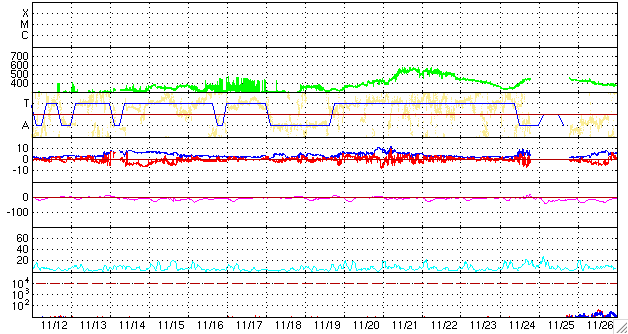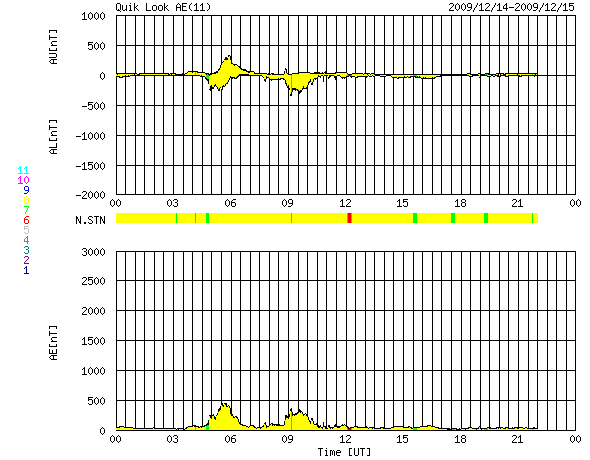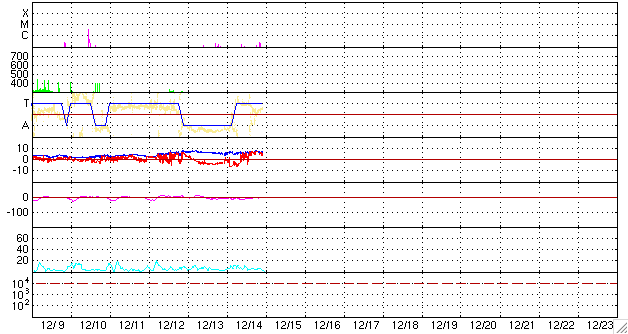 2009/12/15 08:37 更新 太陽風磁場の大きな変動が続いています。1035黒点群が大きくなっています。 担当 篠原 太陽風磁場がやや強まっている状態は、現在も続いています。 昨日のニュース以降も、6〜7nTほどの強さがずっと続きました。 地球にオーロラ活動をもたらした磁場南北成分の強い南向きは、 昨夕、14日18時(世界時14日9時)頃まで続き、 その後は反対に北向きに強まっています。 今日の1枚目の図として、1週間幅の太陽風データを掲載します。 図の右半分の12日以降のところに、今回の特徴的な磁場変化が見えています。 磁場強度(白線)が強まった後、南北成分(赤線)が、 長い時間をかけて大きく南北に振れているのが分かります。 この図を見ると、昨夜から来ている磁場北向きの強まりは、 大きな磁場変化の第二波がやってきている様にも見えます。 この後、一昨日のような連続的な南向きが再びやって来るのかもしれません。 磁気圏のオーロラ活動は、昨日もある程度活発になりました。 AE指数では、300〜400nTほどの小規模変動が2回観測されています。 ライブカメラ(Live!オーロラ)でも、 オーロラのきれいな活動を見ることができました。 昨夜は、途中で太陽風磁場が北向きに切り替わったため、 それ以降はエネルギーの流れ込みが止まり、オーロラ活動も見られなくなりました。 この後、太陽風の磁場は、再び南寄りの傾向を強めるかもしれません。 ACEの最後の部分で、南北成分がマイナス方向に向かっているのが注目されます。 または、磁場の大きな変動はこれで終わって、太陽風は穏やかな状態に戻るかもしれません。 引き続き注目してください。 太陽では、昨日、1034黒点群のすぐ上に現れた小さな黒点群が、大きくなっています。 1035黒点群と番号が付きました。 GOES X線の強まりは、こちらの強まりと関係していたのでしょう。 昨日から、Bクラスの小さな変化が目立っています。 今後、Cクラスの小規模フレアなどを起こす可能性があります。 ACE衛星による7日間の太陽風。速度は黄色、磁場強度は白色、南北成分は赤色。 (c) NOAA/SWPC ![]() SOHO EIT195による太陽コロナ。15日8時半(世界時14日23時半)。 (c) SOHO (ESA & NASA) ![]() SOHOによる太陽可視光写真。1035黒点群が一気に大きくなりました。 (c) SOHO (ESA & NASA) ![]() ACEが観測した太陽風の磁場(1番上の枠、白線は全体の強度、赤線は南北成分) および、太陽風の密度(3番目の橙線)、速度(4番目の黄線) (c) NOAA/SWPC ![]() リアルタイムAE指数 下段のAEグラフの値が高くなると、オーロラ活動が活発化しています。 (c) 京都大学, NICT ![]() シベリアで観測された3日間の磁場データ 右側の3分の1が、昨日のデータになります。グラフが上がったり下がったりすると、オーロラ活動が活発化しています。 (c) NICT ![]() 27日の太陽周期に合わせたデータプロット 太陽が同じ面を地球に向けていた27日前の変化から、今後を予想することができます。 (c) NICT