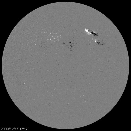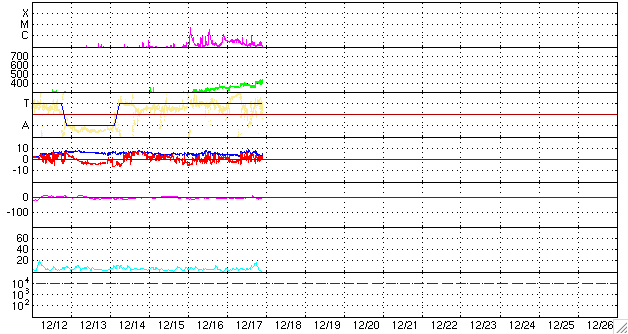 2009/12/18 08:43 更新 1035黒点群は大きな姿を見せています。フレア活動は落ち着いています。 担当 篠原 1035黒点群は、活動がやや落ち着いたようで、 昨日のニュース以降、目立ったフレアは起こしていません。 X線のデータでは、強度も次第に低下しています。 可視光写真を見ると、黒点は大きな2つのかたまりにまとまってきた様です。 今日は、磁場の写真も掲載しています。 白い部分が磁石のN極、黒い部分がS極です。 1035黒点群が見えるあたりに、白と黒がからむように分布しています。 2つの極性が複雑に入り組むほど、その黒点群は大きなエネルギーを持っていると考えられます。 NOAAのレポートによると、磁場分布の複雑さは減少しているそうで、 黒点群の勢力は、下がりつつあるのかもしれません。 規模の大きな状態は続いているので、引き続き中小規模のフレアに対する注意は必要です。 太陽風は、じわじわと速度が上がっています。 今日に入って400km/秒まで上がってきました。 コロナホールの影響が及び始めているのかもしれません。 磁場強度は、速度変化に関係して一時的に8nTくらいに上昇し、 現在は、5nT付近に戻っています。 磁気圏のオーロラ活動は、今のところ静穏です。 太陽風の磁場が、比較的北寄りに推移しているためではないかと思います。 この傾向が南寄りに変わると、磁場強度と速度が平均的なレベルにあるため、 オーロラ活動もやや強まりやすい状況にあると思います。 観望としては楽しみな展開です。 SOHO EIT195の太陽コロナを見ると、東側(左側)の南北両方にコロナホールが見えてきました。 北半球は、新たに出現した領域の様ですし、 南半球は広さが前周期よりも拡大しているようです。 ここからの太陽風の影響も、大きくなっているかもしれません。 SOHO EIT195による太陽コロナ。18日2時半(世界時17日17時半)。 (c) SOHO (ESA & NASA) ![]() SOHOによる太陽の可視光写真。1035黒点群が大きく見えています。 (c) SOHO (ESA & NASA) ![]() SOHOによる太陽面の磁場分布。1035黒点群の磁場が大きく見えています。 (c) SOHO (ESA & NASA) ![]() GOES衛星の太陽X線データ (c) NOAA/SWPC ![]() ACEが観測した太陽風の磁場(1番上の枠、白線は全体の強度、赤線は南北成分) および、太陽風の密度(3番目の橙線)、速度(4番目の黄線) (c) NOAA/SWPC ![]() リアルタイムAE指数 下段のAEグラフの値が高くなると、オーロラ活動が活発化しています。 (c) 京都大学, NICT ![]() シベリアで観測された3日間の磁場データ 右側の3分の1が、昨日のデータになります。グラフが上がったり下がったりすると、オーロラ活動が活発化しています。 (c) NICT ![]() 27日の太陽周期に合わせたデータプロット 太陽が同じ面を地球に向けていた27日前の変化から、今後を予想することができます。 (c) NICT
